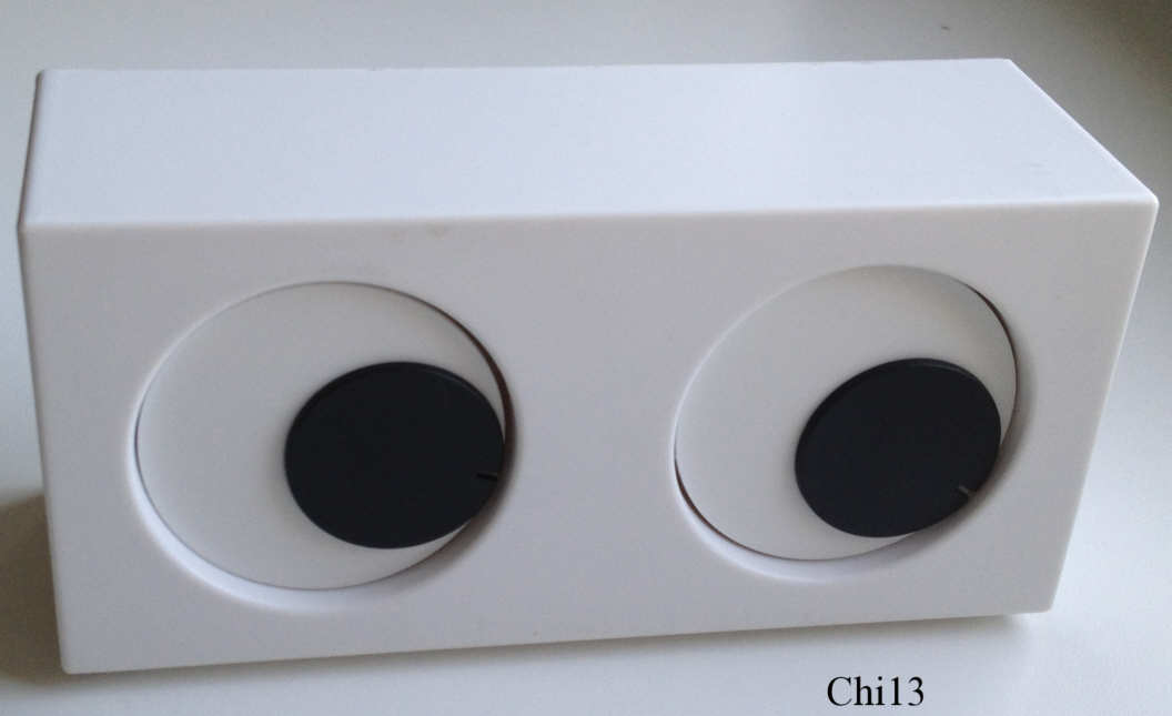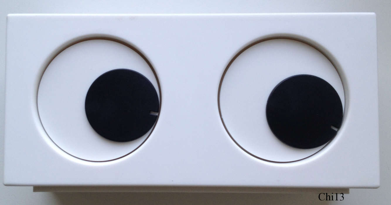 Eine witzige Schreibtischuhr aus China in der Form eines Augenpaares. Das linke Auge zeigt die Stunde, das rechte Auge die Minute. Die Uhr besteht aus zwei nomalen Quartzwerken in einem weißen Plastik Gehäuse. Eine Witzige Idee für eine Schreibtischuhr