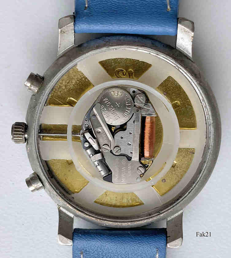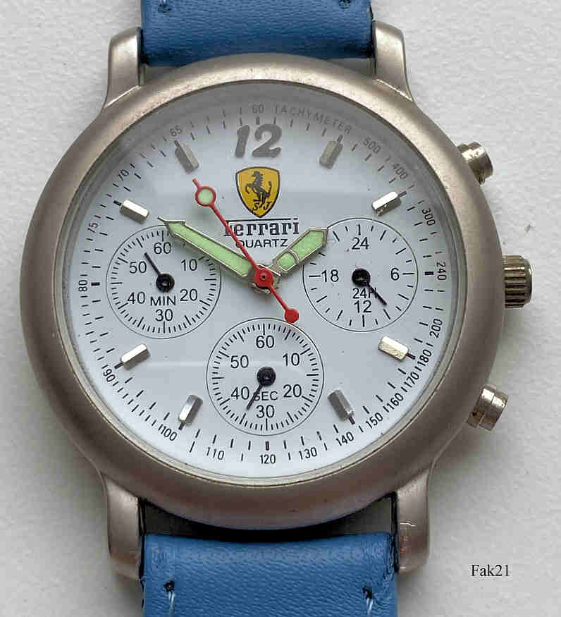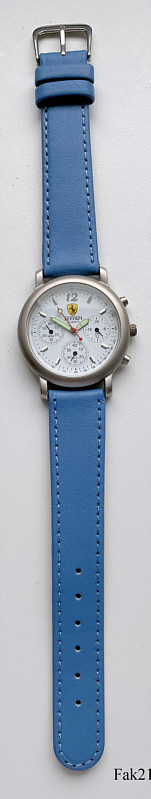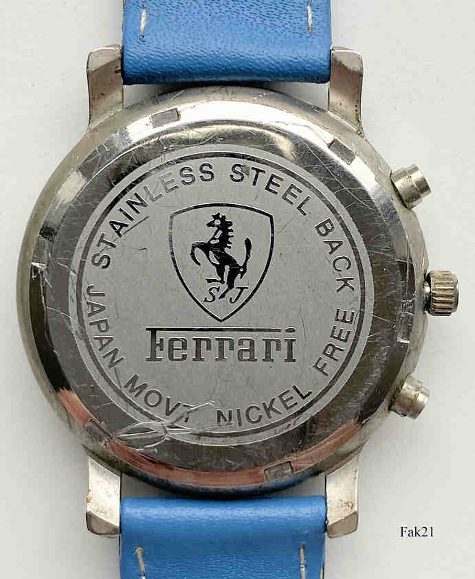 This is the copy of a Ferrari Quartz Chronoraph, whith not working chronographs. Inside a Miyota 280-39 movement. Signed front: ”Ferrari Quartz”, back: “€Ferrari, Stainless Steel Back, Japan Movt, Nickel Free”, inside: “Miyota Co., No Jewels, 280-39”. Blue leather band.
