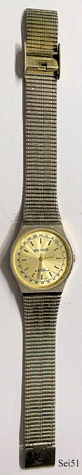 Dies ist eine goldfarbene Seiko Quartz Herrenuhr mit 24 Stunden Zifferblatt. Beschriftung vorn: ”Seiko, Quartz, Water Resistant, Japan Mvt.”, hinten: ”Seiko, POP St. Steel Back, 80076, 2C21 51, Japan”, innen: “No Jewels, Unadjusted, Miyota Co. Japan, 280, 39”. Schwarzes Lederarmband.