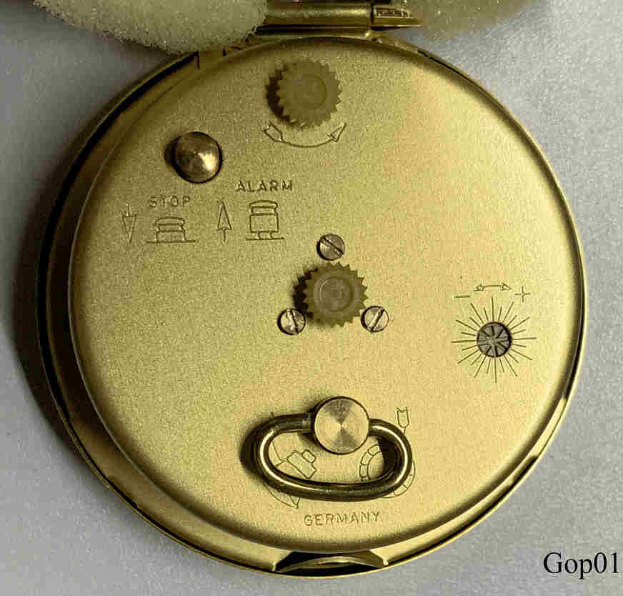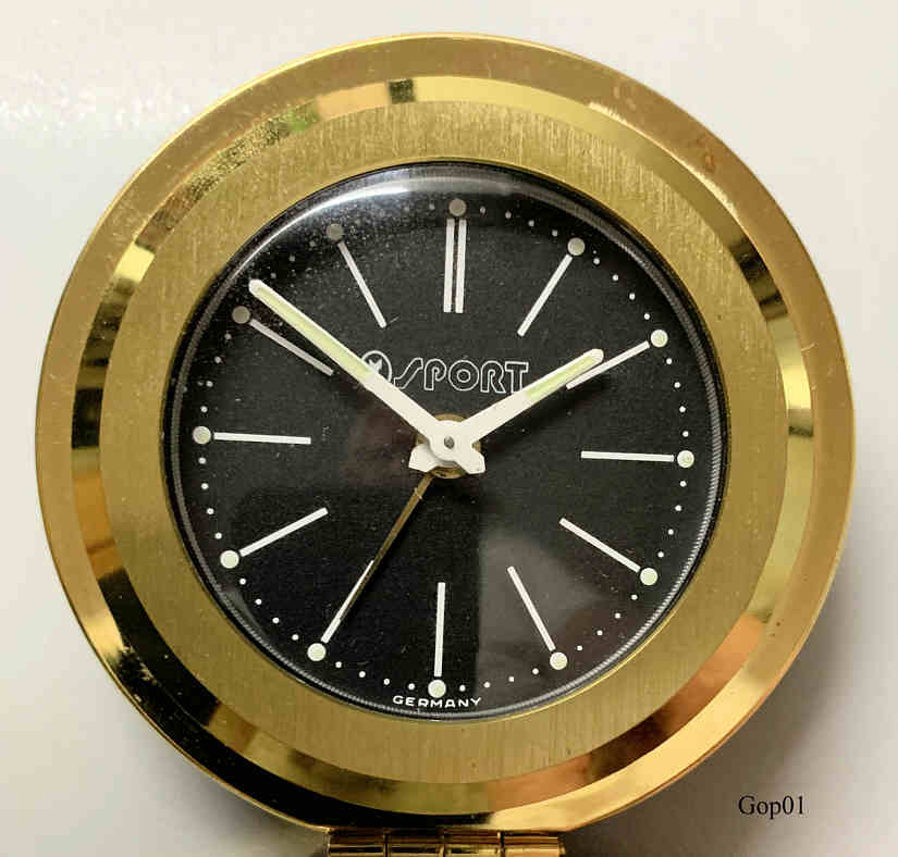 Dies ist ein Reisewecker der Firma Goldpfeil mit dem Markentypischen roten Leder. Beschriftet vorn: ”Pfeillogo, Sport, Germany”, hinten: ”Alarm, Germany”, innen: “W001, W021, 3/91”.