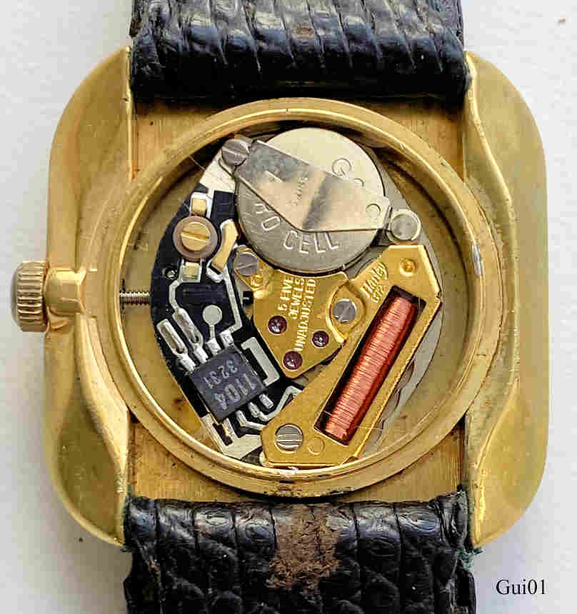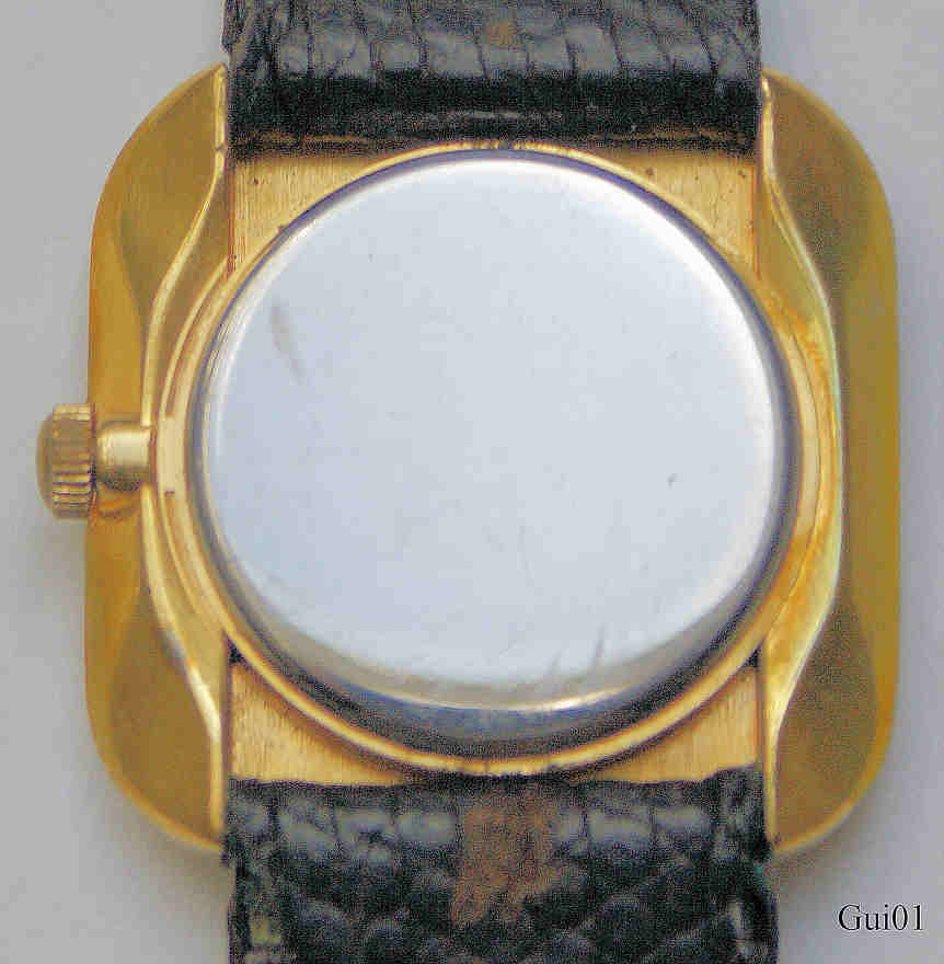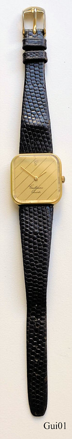 A Designwatch of Guillaume. It has a black leather band. Signed front: “Guillaume, Quartz, Swiss Made”, back: “ ”, inside: “Harley, 672, 5 Five Jewels, unadjusted”. Caliber Harley 672.