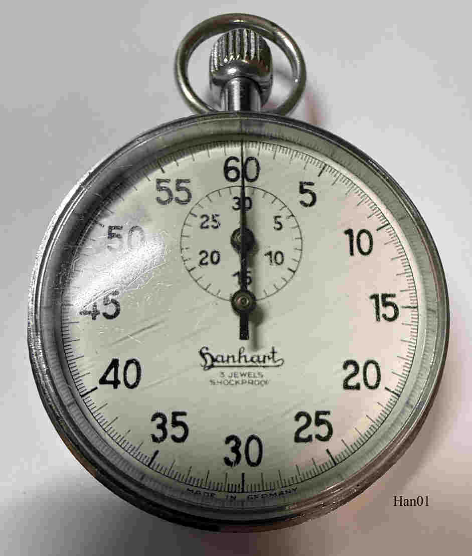 Eine Hanhart Stoppuhr mit silbernem Gehäuse. Beschriftung vorn: ”Hanhart,3 Jewels, Shockproof”€¯, innen: ”€¯452”€¯. Kaliber Hanhart 452