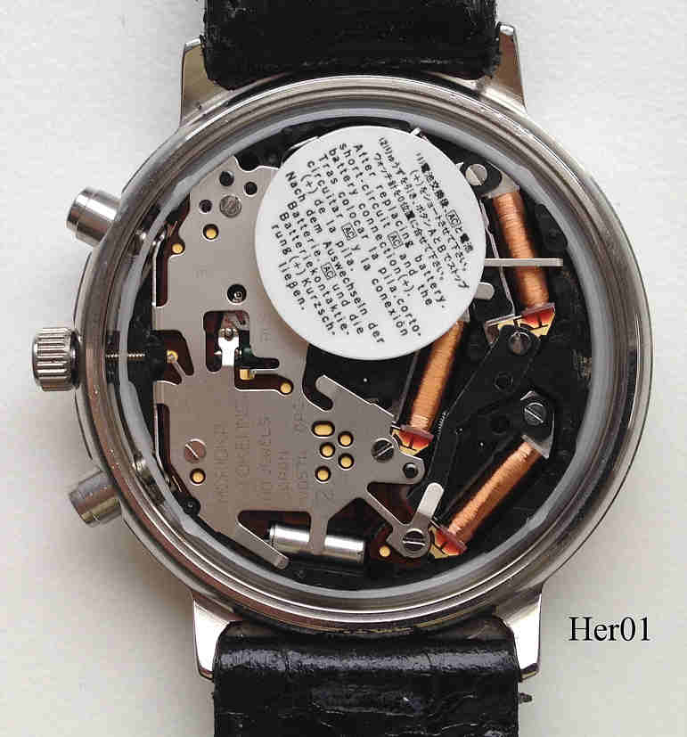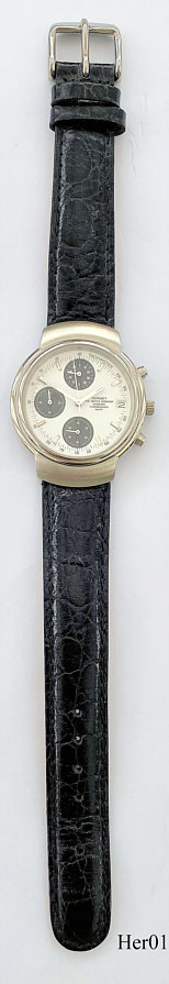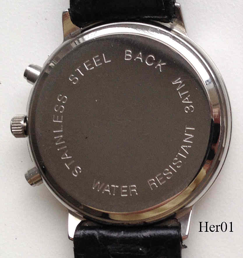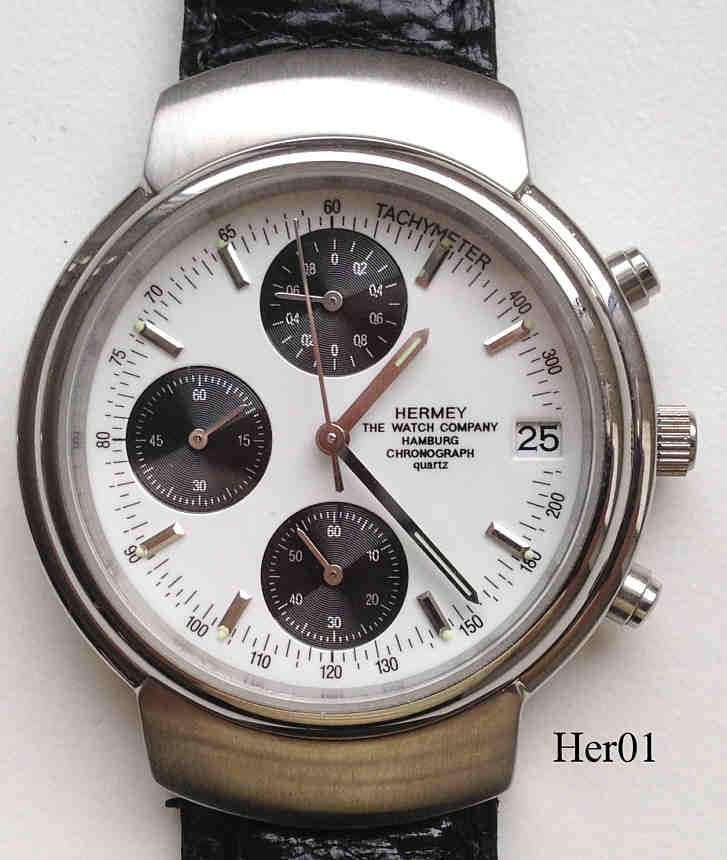 Ein Chronograph aus der Kollektion der Firma Hermey Hamburg. Beschriftet vorn: “Hermey, The Watch Company, Hamburg, Chronograph. quartz”, hinten: ”Stainless Steel Back, Water resistant 3ATM”, innen: “Morioka , Tokai Inc., No Jewels, Japan, VD57A” . Das Werk ist ein Morioka Tokai VD57A. Datum bei der “3”