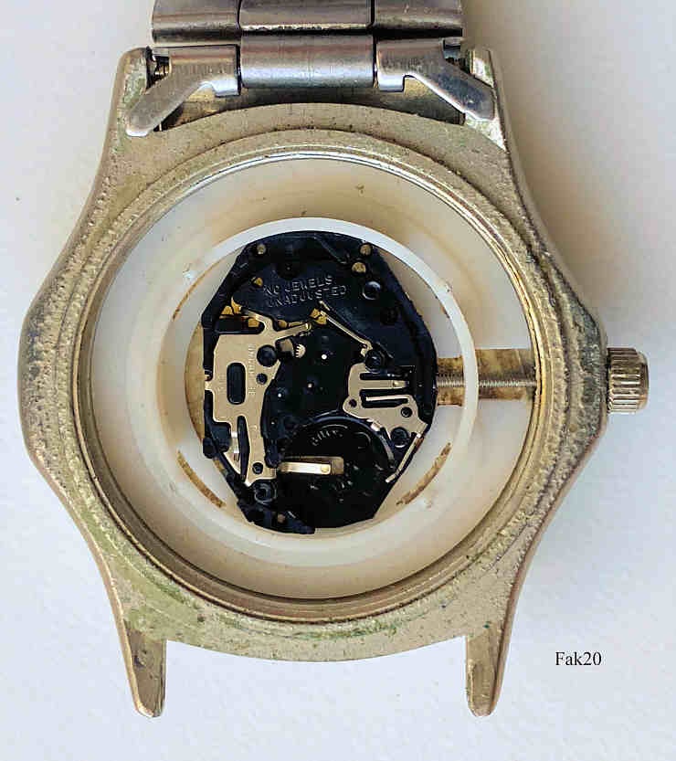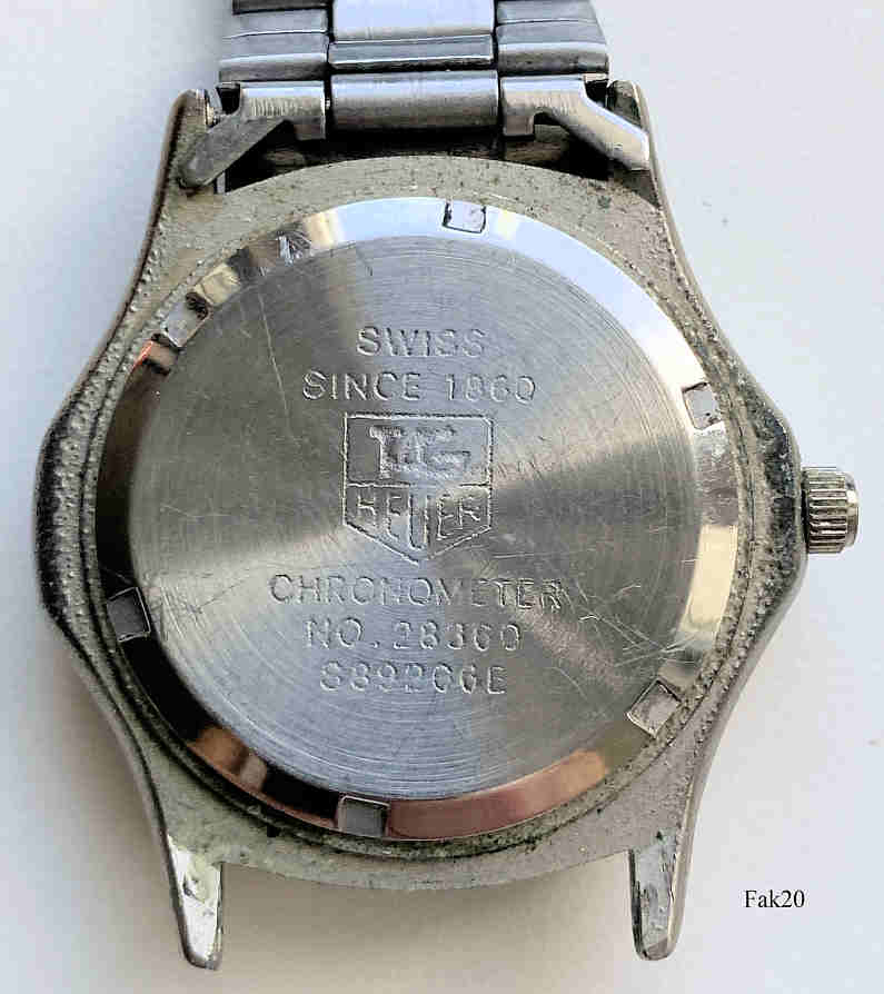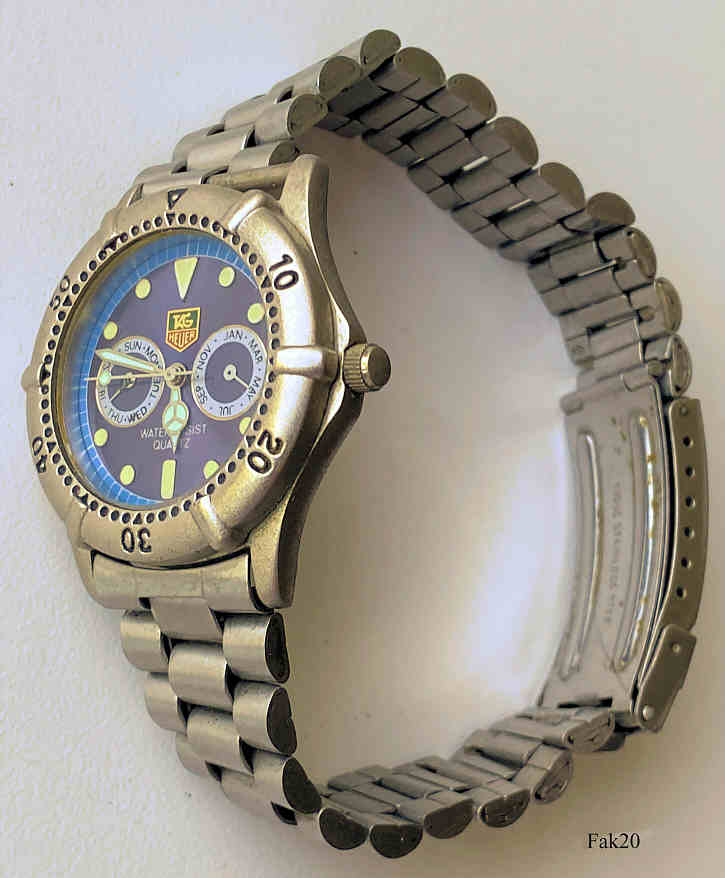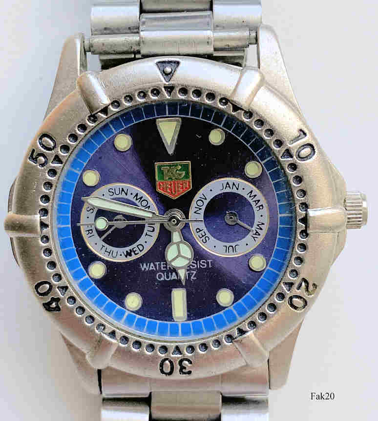 Dies ist eine nachgemachte TAG Heuer, ein billiges Phantasieprodukt. Beschriftet: ”TAG Heuer, Water Resist, Quartz”, hinten: “Swiss, since 1860, Logo, Chronometer, No. 28360, 889206E”, innen: “No Jewels, Unadjusted, Singapore, PC21S, SIS”, Tag bei der 9, Monat bei der drei, kein Datum (!), drehbare Lunette. Innen ein einfaches Quartz Uhrwerk SIS PC21S. Base Metal Gehäuse mit Edelstahl Schraubboden und einfachem Edelstahl Gliederarmband.