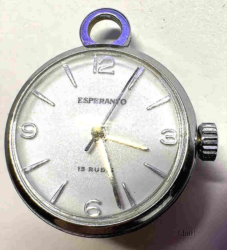 Eine Handaufzugs Werbe-Kugeluhr als Kettenuhr, Kaliber CRC 960/21. Hergestellt in Frankreich bei der ”Montres Esperanto”, eine Tochterfirma der Cupillard-Vuez & Rieme. Beschriftet vorn:”Eperanto, 15 Rubis”, innen: ”CRC960” . Gehäuse Base Metall, Zifferblatt mit 8 Stegen und 4 arabischen Ziffern. Auf dem Ring eingeprägt “Iduna” .