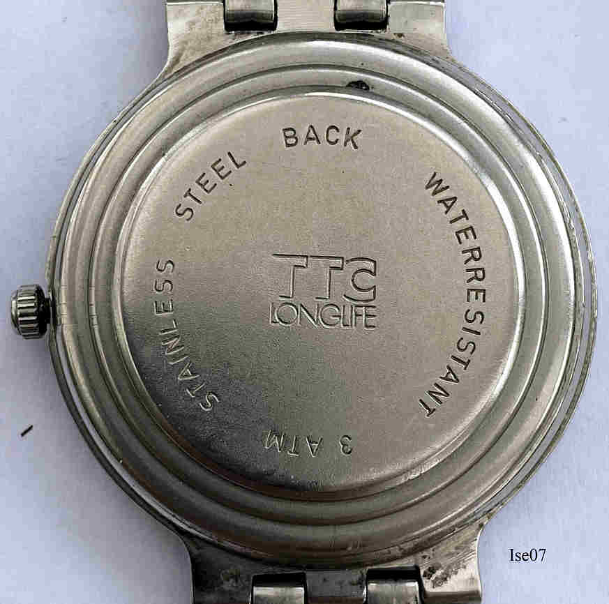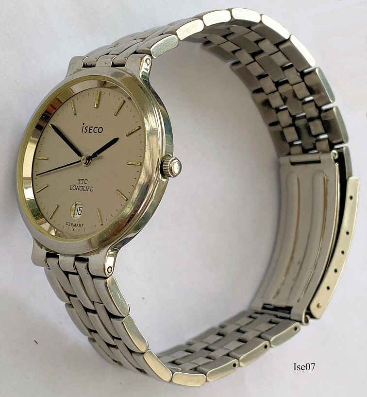 Eine Iseco TTC Longlife Uhr mit schlichtem, grauen Zifferblatt, Datum bei der 6. Beschriftet vorn: “Iseco, TTC Longlife, Germany”, hinten: “Stainless Steel Back, Water Resistant 5 ATM, TTC Longlife”, innen: “Swiss, Harley, Ronda SA., Five Jewels, TTC”. Die gleiche Uhr wurde von Junghans heraus gebracht, nachdem Junghans die Nachfolge von ISECO angetreten hat. Longlife bezieht sich auf die Batterie, auf die die Firma 20 Jahre! Garantie gibt. Die ganze Rückwand ist die Batterie. Leider überstand ISECO die Garantiezeit nicht, und Junghans übernahm die Garantieverpflichtung.