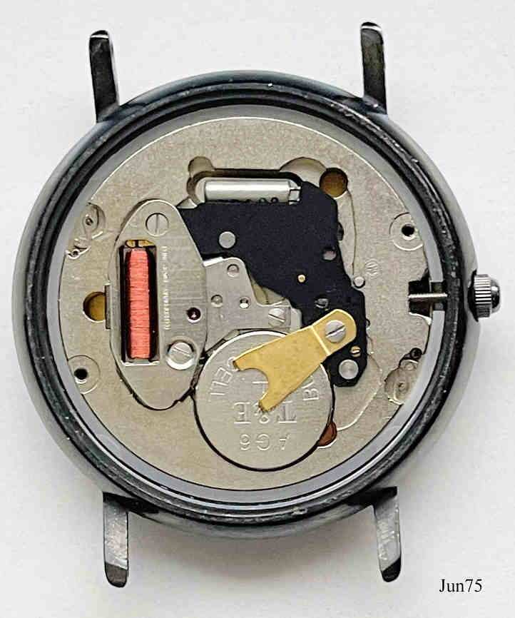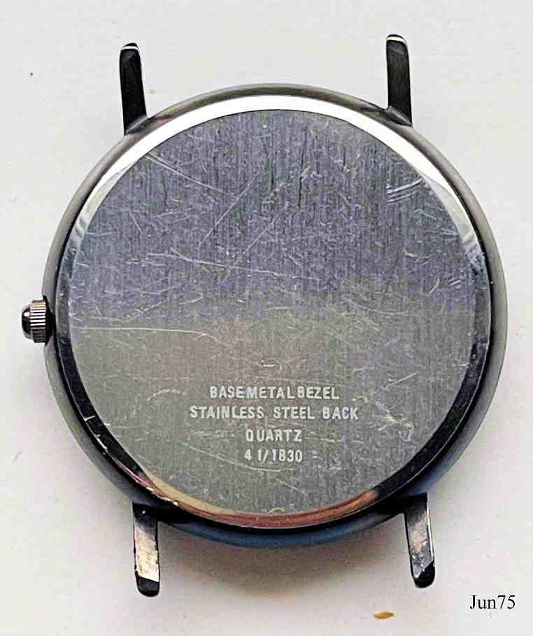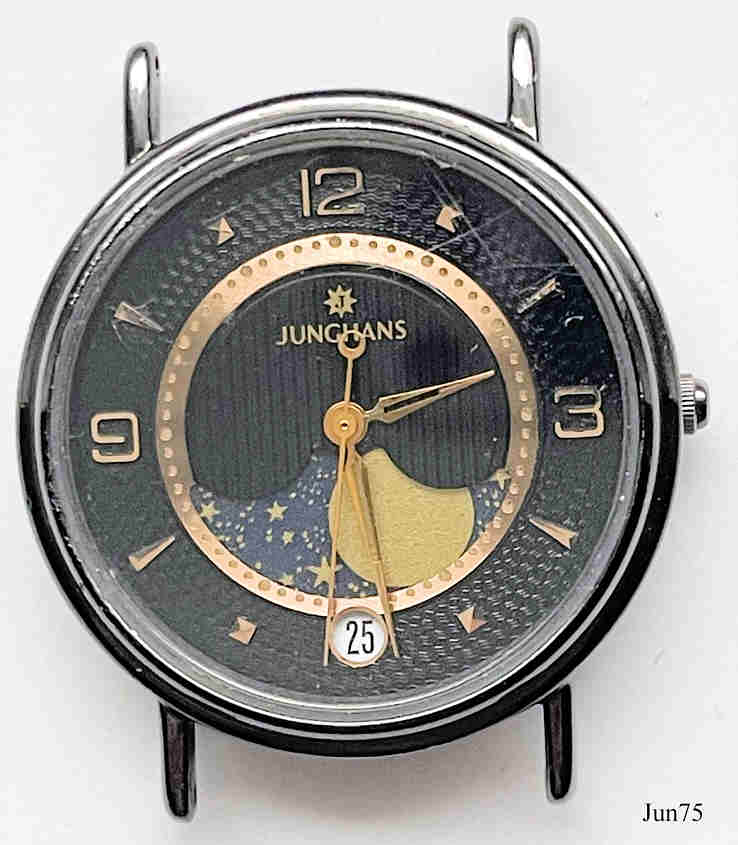 Eine Junghans Herrenuhr mit schwarzem Zifferblatt und Anzeige der Mondphase und Kalender bei der 6. Schwarzes Gehäuse und Stainless Steel Back. Beschriftet vorn: ”€¯Junghans”€¯, hinten: ”Base Metal Bezel, Stainless Steel Back, Quartz, 41/1830”,€¯ innen: ”One 1 Jewel, Unadjusted, FE, 7220, Germany”, Kaliber France Ebauches 7220.