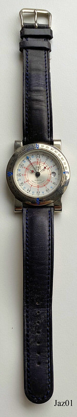 Dies ist eine Jaz Quartzuhr, sie verwendet ein Quartz Werk von Shiojiri. Beschriftet vorn: ”Jaz, Paris, Quartz, Water Resistant”, hinten: “Jaz, Paris, ZMYZ7BP, Assembled in France, Water Resistant, Base Metal Bezel,Movt. Japan, Stainless Steel Back”, innen: ”98, Japan, Shiojuri Ltd., V339A, Unadjusted, one Jewel”. Die Uhr hat ein ansprechendes Gehäuse mit Kompaßeinteilung auf dem Außenring. Das Zifferblatt hat im Innenring eine 12 Stunden Einteilung in rot und im Außenring eine 24 Stunden Einteilung in Schwarz mit einem GMT Zeiger mit blauer Spitze. Datum bei der 3, schwarzes Lederarmband.