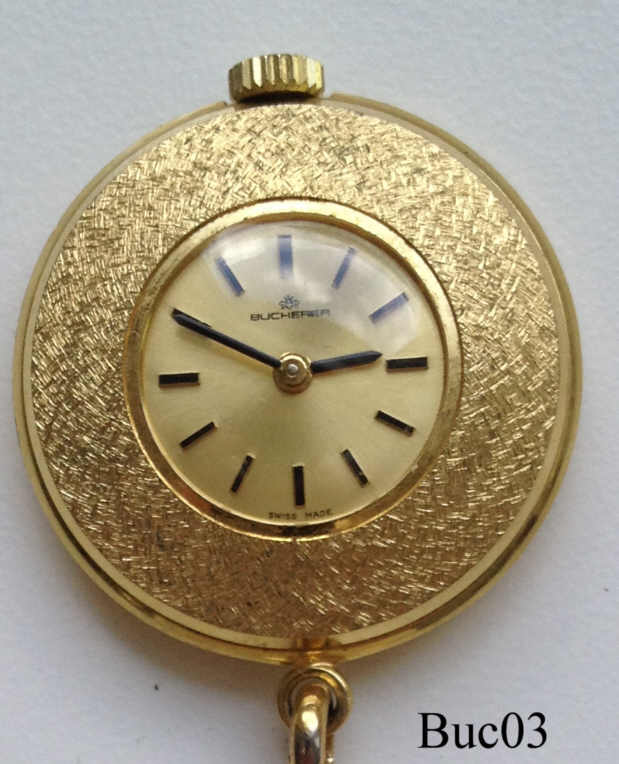 A chainwatch of Bucherer with a long neckchain. There is a nice blue decoration on the back. Signed front: “ Bucherer, Swiss Made”, inside:” Bucherer, Adjusted Three 3 pos., seventeen 17 Jewels, Swiss, FEF 6664”, in the Back: “Bucherer Swiss, 963 4”. Caliber FEF 6664, 21600 Halfbeats.