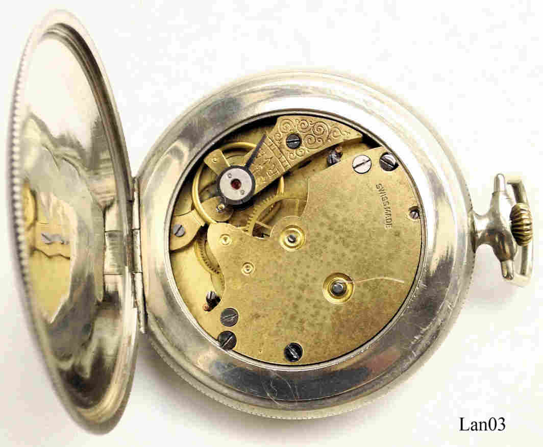 Eine sehr schöne Taschenuhr der Firma Langendorf. Beschriftung vorne: “Langendorf”, innen: “S”, auf dem Werk: “Swiss Made” Sie hat ein sehr schönes Rauten Zifferblatt mit geschwungenen Ziffern, Sekunde bei der “6”. Auch die Zeiger sind sehr schön gemustert.
