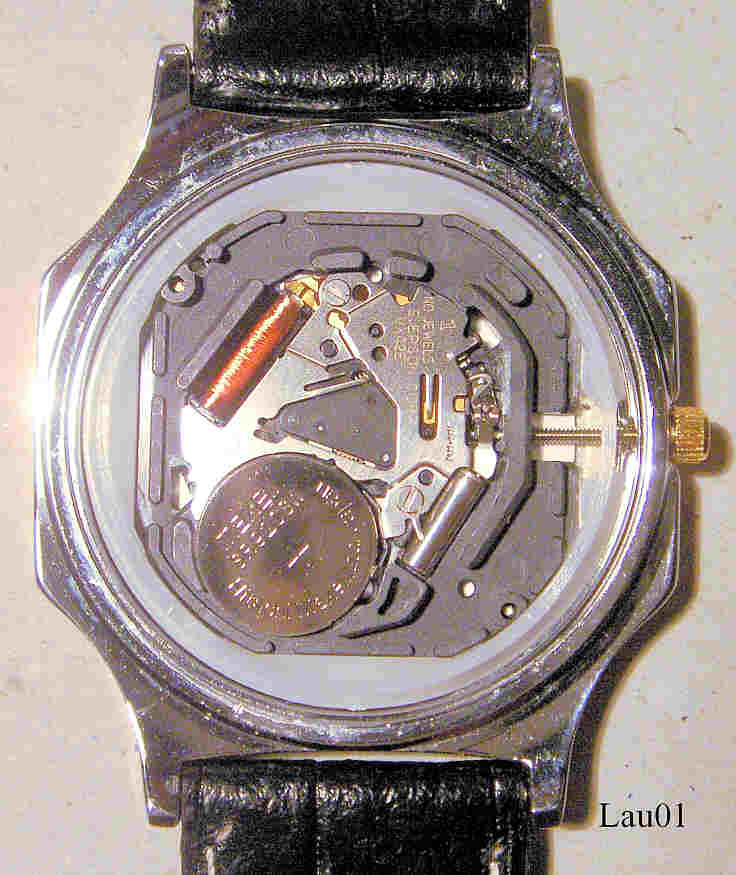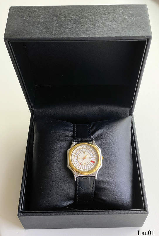 Dies ist eine Laurine Damenuhr mit ungewöhnlicher Datumsanzeige. Ein rotes Feld läuft links herum unter den 31 Fenstern durch. Beschriftet vorn: ”Laurine, PRG-B1033GD”, hinten: ”LP, Laurine, PRG-XB1033GDL, Stainless Steel Back, 3 ATM Water Resistant, Original PRG”, innen: “1, Japan, No Jewels, S.Epson Corp., VX42E”, Angetrieben von einem Epson Werk Kaliber VX42E, 0 Jewels, schwarzes Lederband.