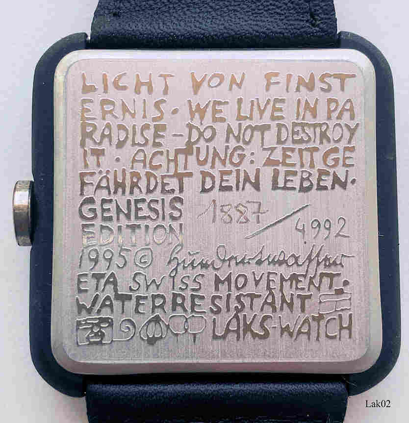 Dies ist die zweite Uhr der Genesis Kollektion von Friedensreich Hundertwasser. Beschriftet vorn: ” ”, hinten: ”Licht von Finsternis. We live in a Paradise- Do not destroy it. Achtung: Zeit gefährdet Dein Leben. Genesis Edition 1887 / 4992, 1995 Hundertwasser, ETA Swiss Movement. Water Resistant. Laks Watch ”, innen: “One 1 Jewel, ETA 902.105, Swiss Parts, Thailand Movement ”, Schwarzes Lederband mit Hundertwasser Schriftzug. Limited Edition 4992 Stück, dies ist Nummer 1887. Das Licht entsteigt einem Fenster der Stadt. Die Fenster der Großstadt sind wie ein Sternenhimmel. In der Stadt sieht man die Sterne nicht, denn die vielen künstlichen Sterne überleuchten die Sonnensterne. Die Nacht zum Tag machen zu wollen ist nur eines der vielen Zeichen des Hochmutes des Menschen, gegen die Schöpfung zu agieren.