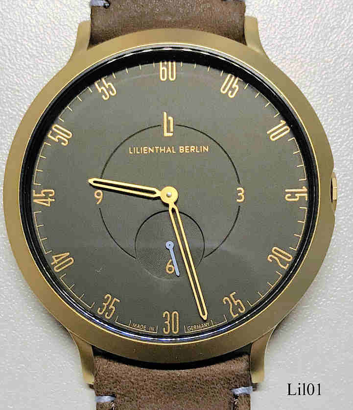 Die erste Uhr der Designfirma Lilienthal Berlin. Das Gehäuse ist aus Edelstahl. Beschriftung vorn: ”Lilienthal Berlin, Made in Germany “€, innen: “2 Two Jewels, Ronda, Swiss Parts, 1064”, hinten: ”Ronda Movement, All Stainless Steel, Water Resistant 5 ATM, L01 106 1737R 0296 ”€. Uhrwerk Kaliber Ronda 1064, Braunes Lederarmband. .