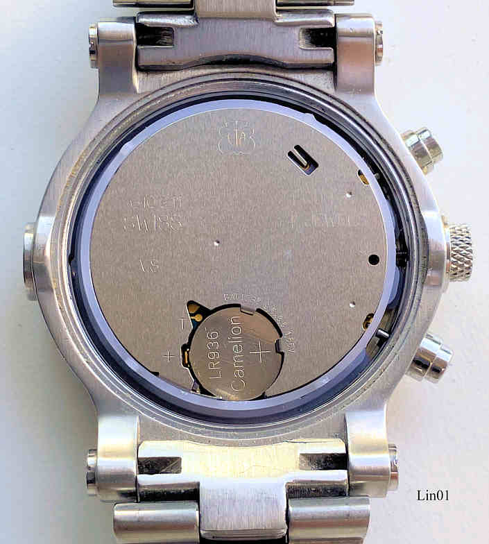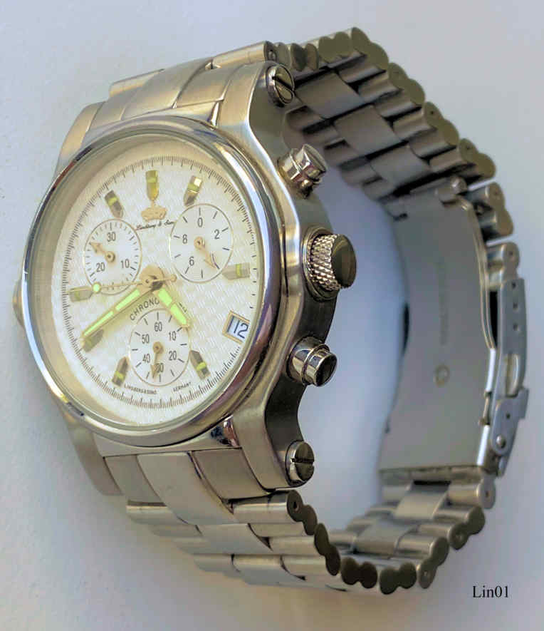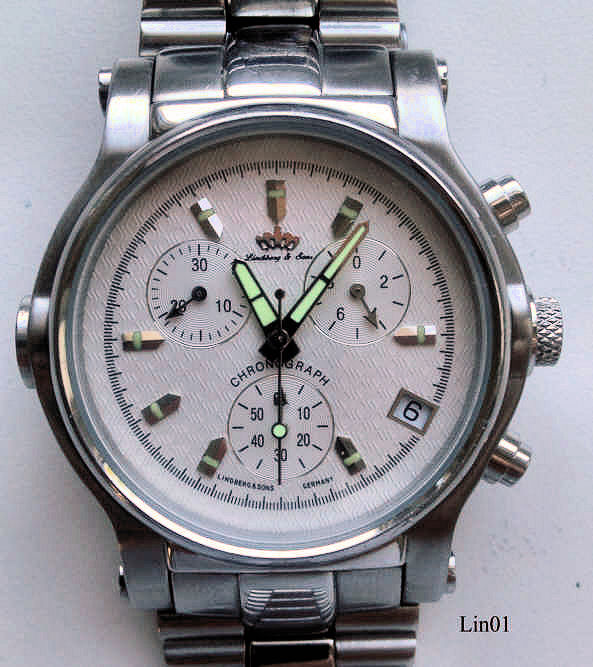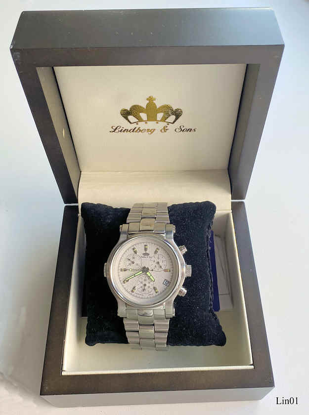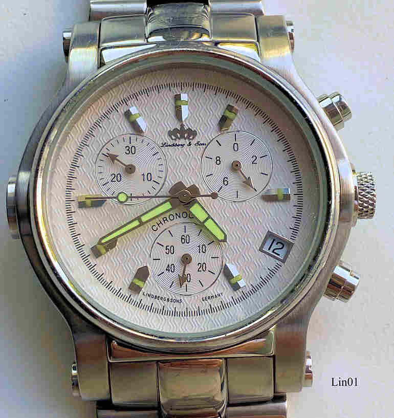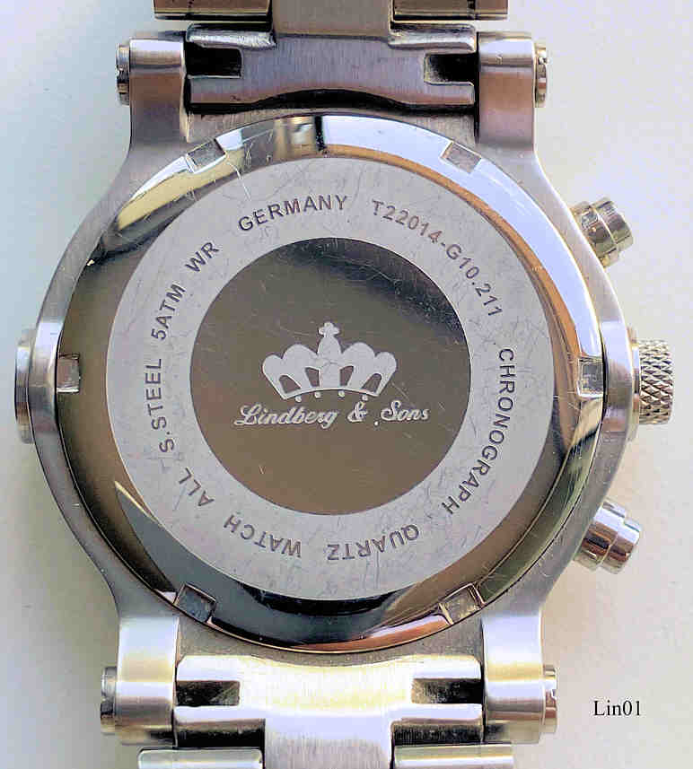 A Chronograph of the Collection from the company Lindberg&Sons, model Navigator. Signed front: “Lindberg&Sons, Chronograph, Lindberg&Sons Germany”, back: ”Chronograph Quartz Watch, All St. Steel, 3 ATM WR, Germany, T22014- G10.211”, inside: “G10.211, Swiss, V8, ETA, Four 4 Jewels” . ETA G10.211 movement, Date at “4”