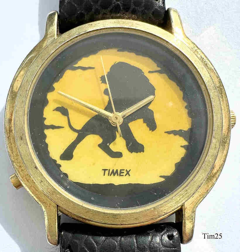 Dies ist eine Timex Indiglo Uhr zum Musical “The Lion King”. Beschriftet vorn: ”Timex”. hinten: ”The Lion King, c.Disney, Stainless Steel Back, Movement Philippines, Assembled in Hong Kong, Base Metal Bezel, Water Resistant”. Innen: ”No (0) Jewels , 3V. 01, M549”. Bei Druck auf den Knopf bei 7,5 leuchtet der Löwen Hintergrundt grün auf und ist damit im Dunkeln sehr gut abzulesen.