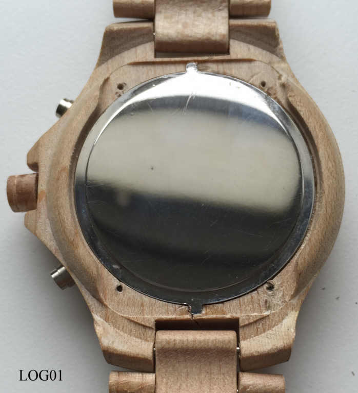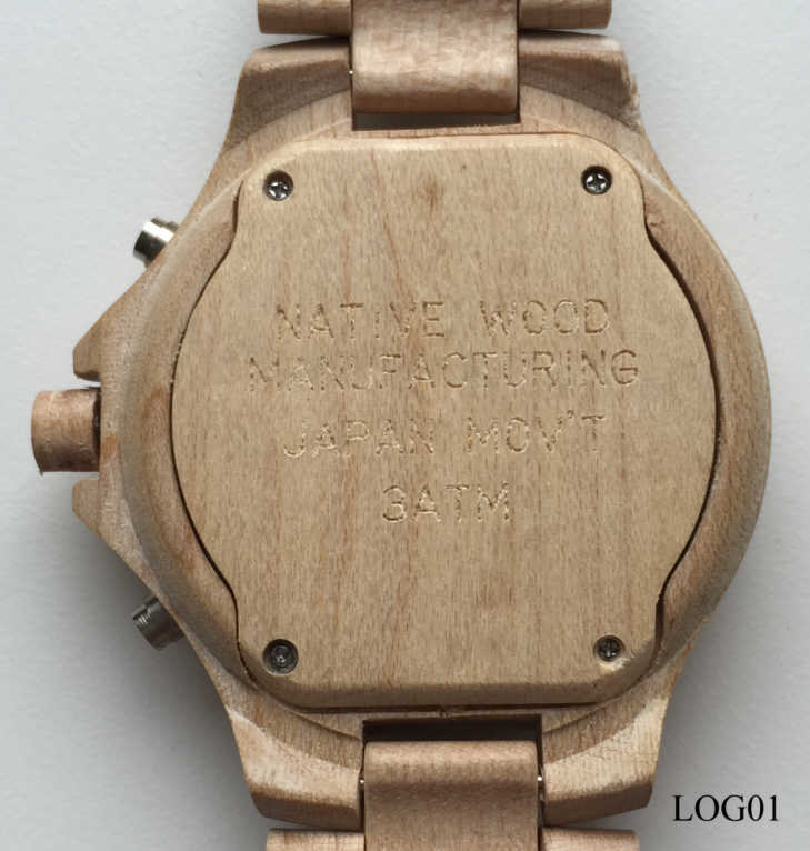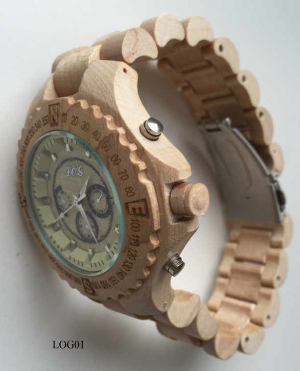 A beautiful woodwatch of LOG with quartz movement. The complete watch as well as the band, except movement and clasp, is made of maplewood. Signed front: “LOG”, back: “ Native Wood, Manufacturing, Japan Mov’t, 3ATM”. The band is also made of maple with folding clasp.