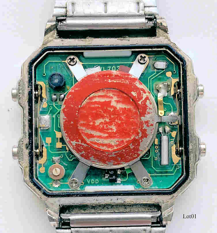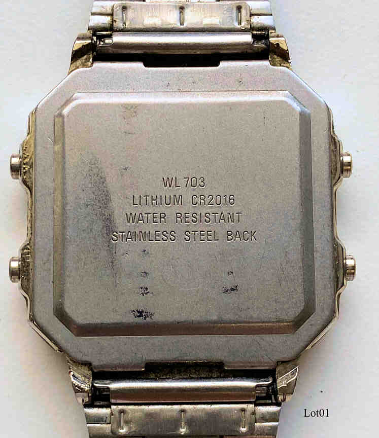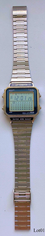 Eine Lottouhr unbekannter Herkunft mit der Sonderfunktion Zufallsgenerator für Lottozahlen. Einstellbar ist die Auswahl x aus y, wobei y maximal 49 ist, x ist 1-9. Beschriftet vorn: ”Lottowatch, Water 30M Resist”, hinten: ”WL703, Lithium CR2016, Water Resistant, Stainless Steel Back”, innen: “WL703,VDD”. Funktionen: Uhr, Stoppuhr, Lottogenerator. Metall Gehäuse mit Edelstahl Armband.