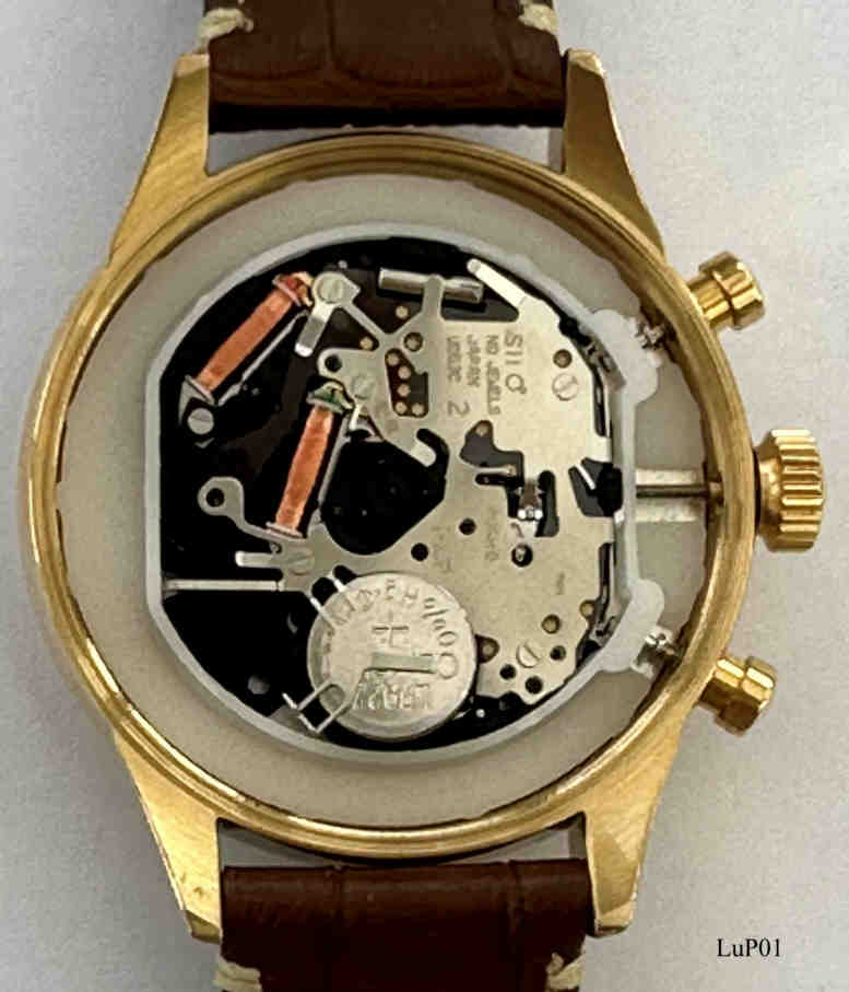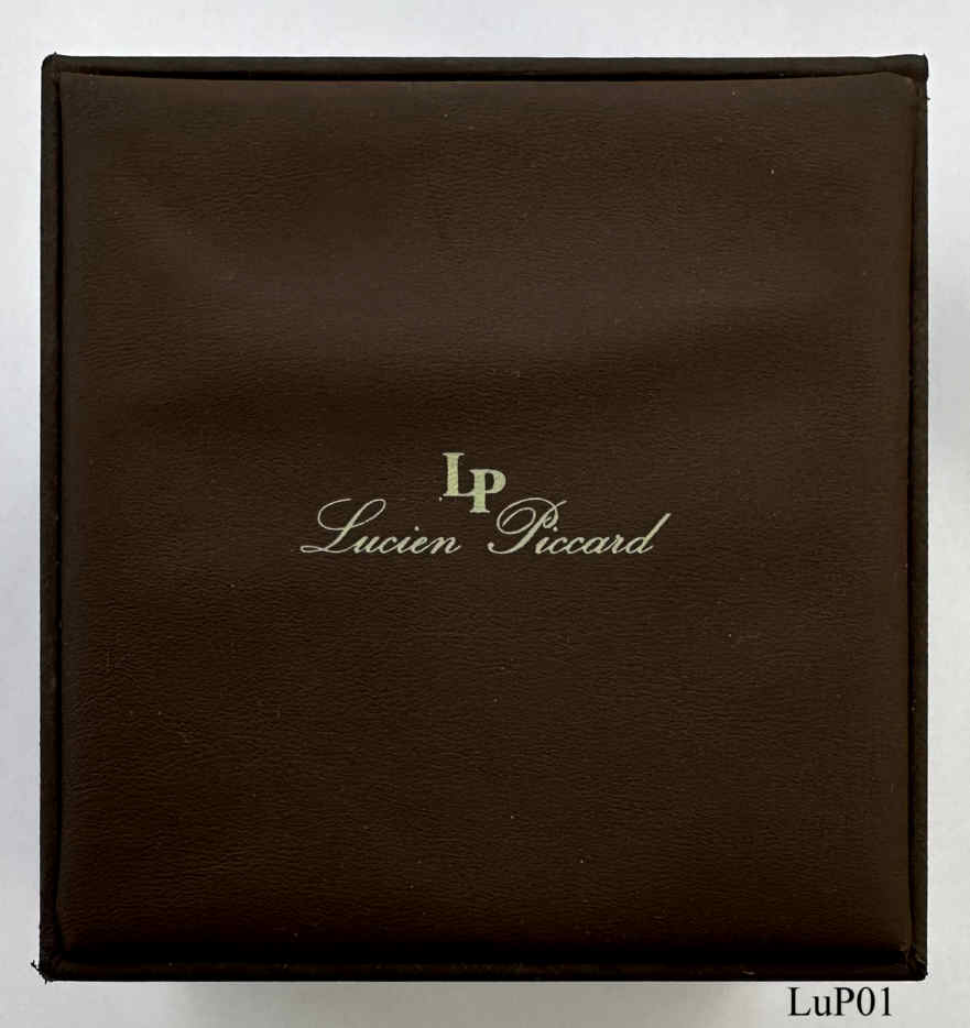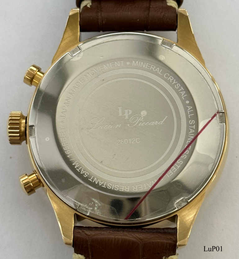 Ein Chronograph der Marke Lucien Picard. Beschriftet vorn: “LP, Lucien Picard”, hinten: ”LP, Lucien Picard, 28012C, Japan Made Movement, Mineral Crystal, All Stainless Steel, Water Resistant 5 ATM/165 Feet ”, innen: “SIIO, no Jewels, Japan, VD53C” . Das Werk ist ein SIIO VD53C, Datum bei der “4:30”, Braunes Leder Armband.