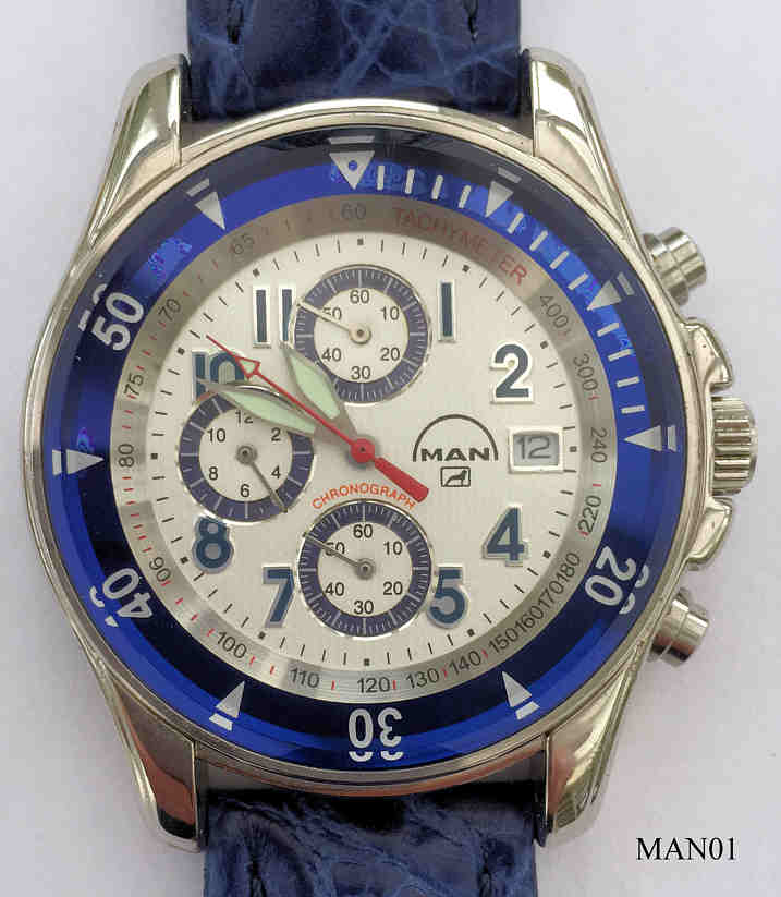 Ein Quartz Chronograph der Firma MAN mit weißem Zifferblatt, blauem Ring, verchromtem Gehäuse und Edelstahl Rückdeckel. Beschriftet vorn: “MAN, Chronograph”, hinten: ”5 ATM Water Resistant, Stainless Steel back, MAN”, innen: “Miyota Co.,OS10, No 0 Jewels, Japan”, Werk Caliber Miyota OS10,
