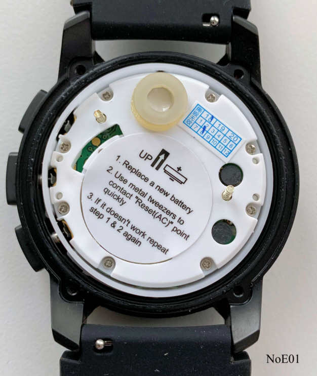 A North Edge multifunktion watch, Modell Mount. Stainless Steel case, signed front: ”North Edge, Mount, WR 50 M/164 Feet”, inside: “ ”, back: ”North Edge, Mount, WR 50 M / 164 ft, Designed by, North Edge”. At 6 an LCD Display to show the funktions. The watch has a Magnet-, Thermo- und Air pressure sensor, to handle following funktions: Air pressure (Meteo), Altitude (Alti), Temparature (Thermo),Compass (Compass), as well as Alarm, Chrono, Date and time. Selection of the funktions is done via the middle button, and circles the functions. The pointers show the selected function and the corresponding value is shown in the LCD. In the compass function the pointers set straight and the minute pointer points to the North, the hour pointer to theSouth€. This is a not so true copy of the Tissot T-Touch, without the sensitive Display.