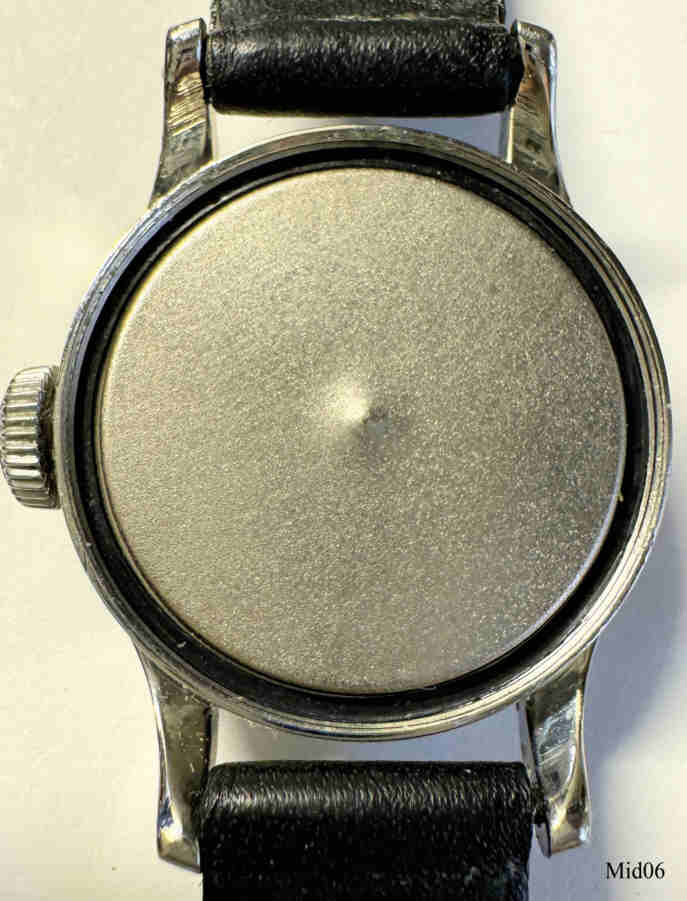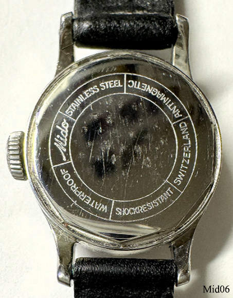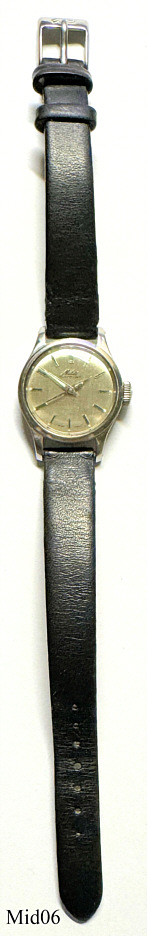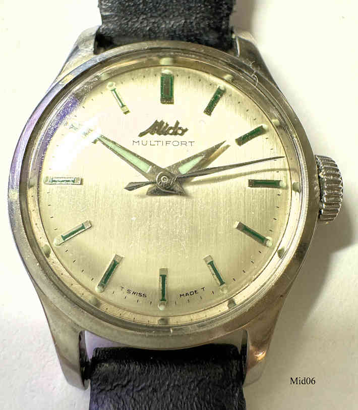 Dies ist eine Mido Multifort Damen Handaufzugsuhr im Edelstahl Gehäuse mit dem Kaliber Mido 813. Das Werk ist durch eine Schutzkappe abgeschirmt. Beschriftet vorn: “Mido, Multifort, Swiss Made”, hinten: “Mido, Stainless Steel, Antimagnetic, Switzerland, Shockresistant, Waterproof”, innen: “Mido, 813, Seventeen 17 Jewels, Swiss”. Schwarzes Leder Armband.