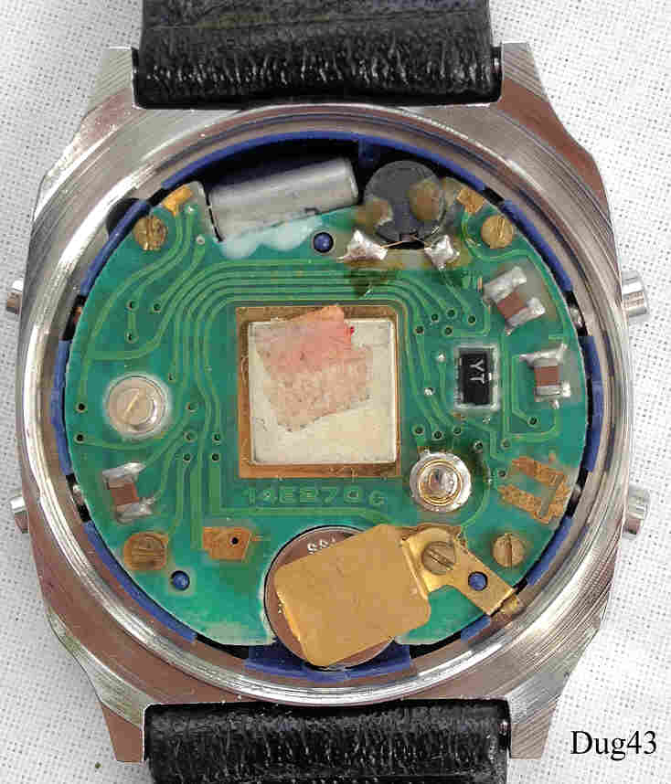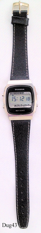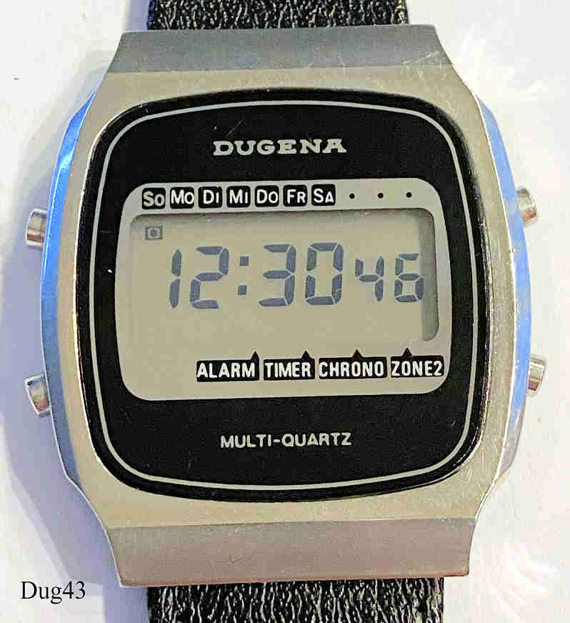 Ein Dugena LCD Alarm Chronograph mit Edelstahl Gehäuse und Stainless Steel Back. Beschriftung vorn: ” Dugena, Multi-Quartz”,€ hinten: ” “ innen: ” 14E270c” Alle Anzeigen erfolgen auf einem LCD Display, Uhrzeit und Wochentag gleichzeitig. Schwarzes Lederarmband mit neutraler Schließe.