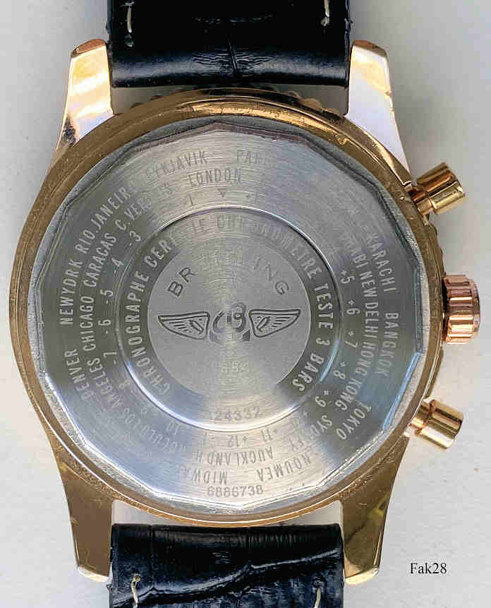 Dies ist ein Nachbau der Breitling Navitimer. Beschriftet vorn: “Breitling, 1884, Chronometre, Navitimer”, hinten: “Breitling 1884, Chronographe Certifie, Chronometre Teste 3 Bars, A24332, 6886738”, innen: “Sunon, PE70, No Jewel, Unadjusted”. Schwarzes Lederarmband.