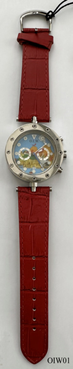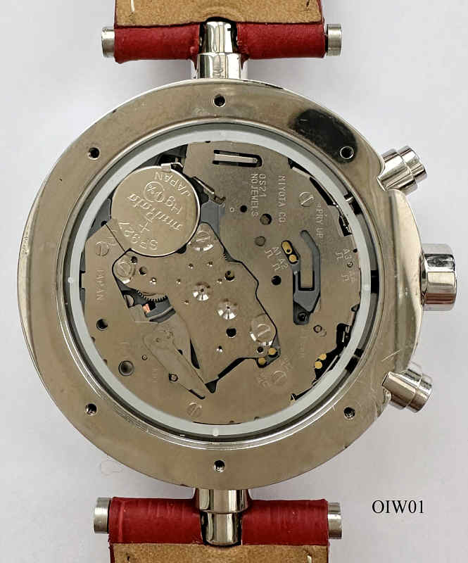 Ein O.I.W. Chronograph mit Base Metal Gehäuse und verschraubtem Base Metal Back, ein Quartz Chronograph mit Miyota OS21 Werk. Beschriftet vorn: ”O.I.W.”, hinten: “Officine Italiane Wrist Watch, O.I.W., I live....and you?, 0258C, Subproof 5ATM”. Innen läuft ein Quartzwerk der Firma Miyota, KaliberOS21. Verschraubte Krone, Rotbraunes Armband. Datum bei der “6”.