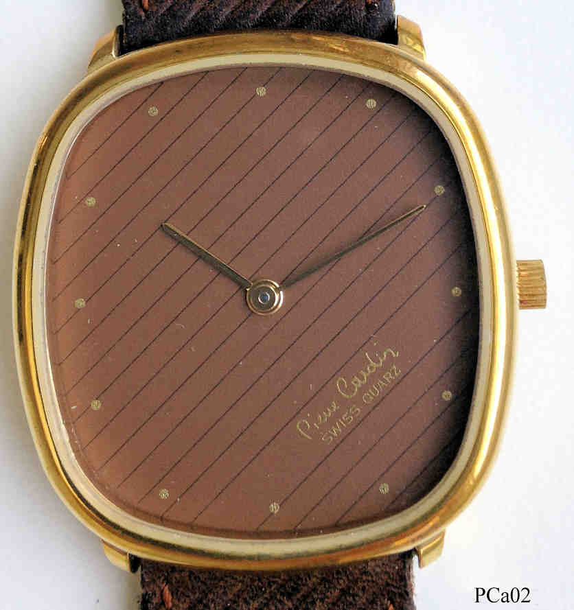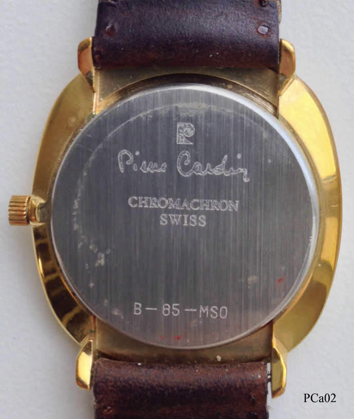 A beautiful dresswatch of Chromachron, Design classic of Pierre Cardin. Golden base Metal case. Signed front: “Pierre Cardin, Swiss Quartz”, inside: ”561.001, One 1 Jewel”, back: “Pierre Cardin, Chromachron, Swiss B-85-MS0”. Movement Caliber ETA 561.001. Brown leather band