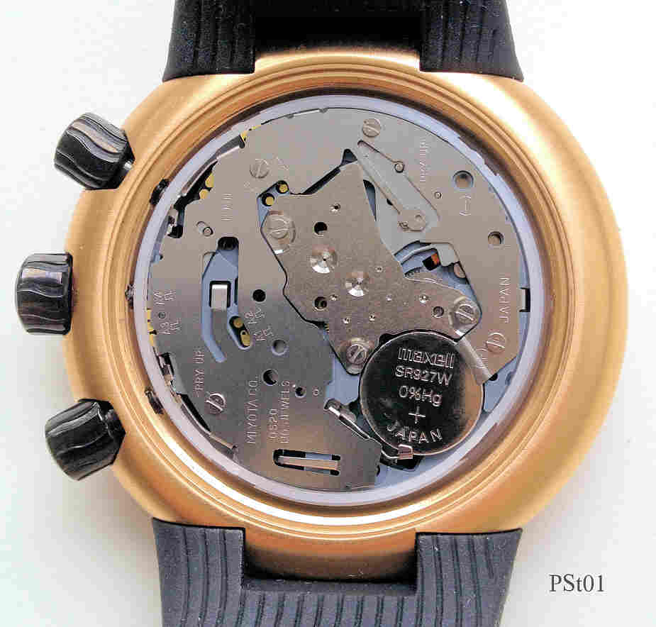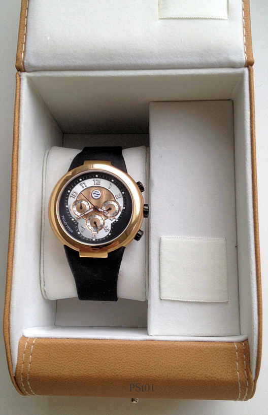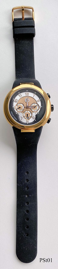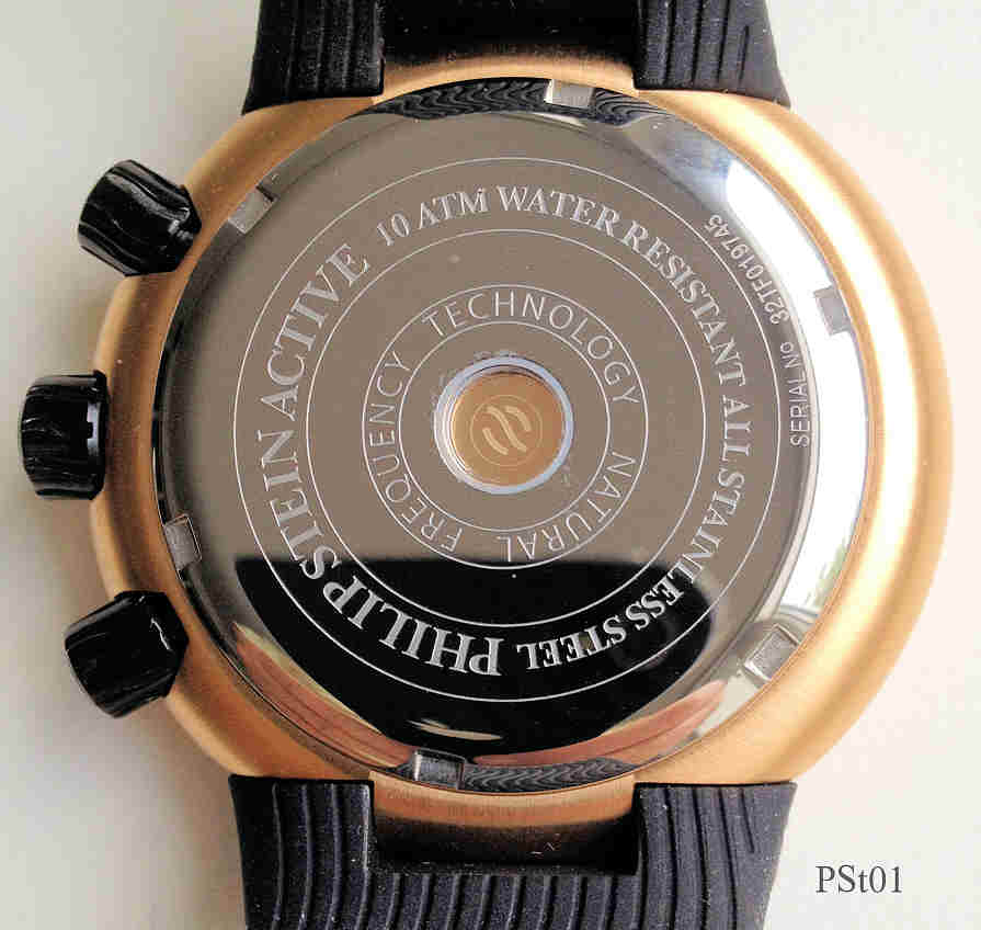 Ein Chronograph Modell Active der US Marke Philip Stein. Beschriftet vorn: “Philip Stein”, hinten: ”Philip Stein Active, 10 ATM Water Resistant, All Stainless Steel, Natural Frequency Technology, Ser. No.: 32TF019745”, innen: “Miyota Co., 0S20, No 0 Jewels, Japan” . Das Werk ist ein Miyota 0S20, Datum bei der “6”, Kautschuk Armband. Philip Stein vertreibt die Natural Frequency Technology, bei der ein Modul eingebaut ist, was die Energiefelder des Menschen verstärken soll. Dies soll Streesmindernd wirken. Die Uhr haben wir auf unserer Alaska Kreuzfahrt an Bord der Norwegian Pearl gekauft.