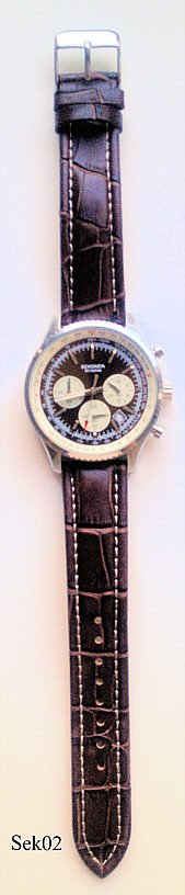 Ein Chronograph der Firma Sekonda im Piloten Look mit braunem Lederband. Beschriftet: “Sekonda, 50 Metres”, hinten: ”Stainless Steel Back, Sekonda, Water Resistant 50 Metres, Japan Mvt, N3407, Assembled in China, BPT”, innen: ”SIIO, No Jewels, Japan”. Das Werk ist ein SIIO Kaliber VD53B. Datum bei der 4. Gekauft auf dem Rückflug von Dublin.