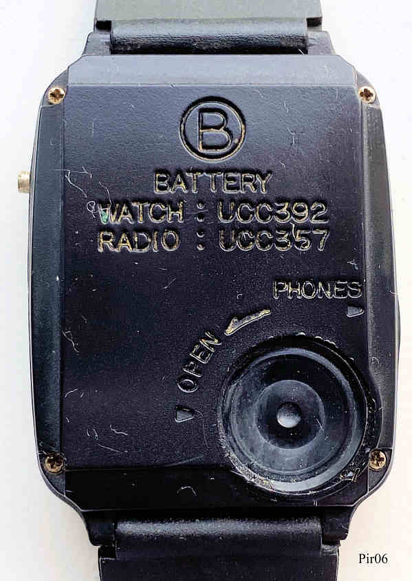 A PiratronRadio Watch, a digital watch with LCD Display: Time, Seconds, Signed front: ”Piratron, Quartz, Radio-Watch”, back: ”SB, Battery, Watch: UCC392, Radio: UCC357”. Practically thewre are two separate devices: a watch and an AM Radio. On the front to see the tuning knob, on the side the arphone jack.
