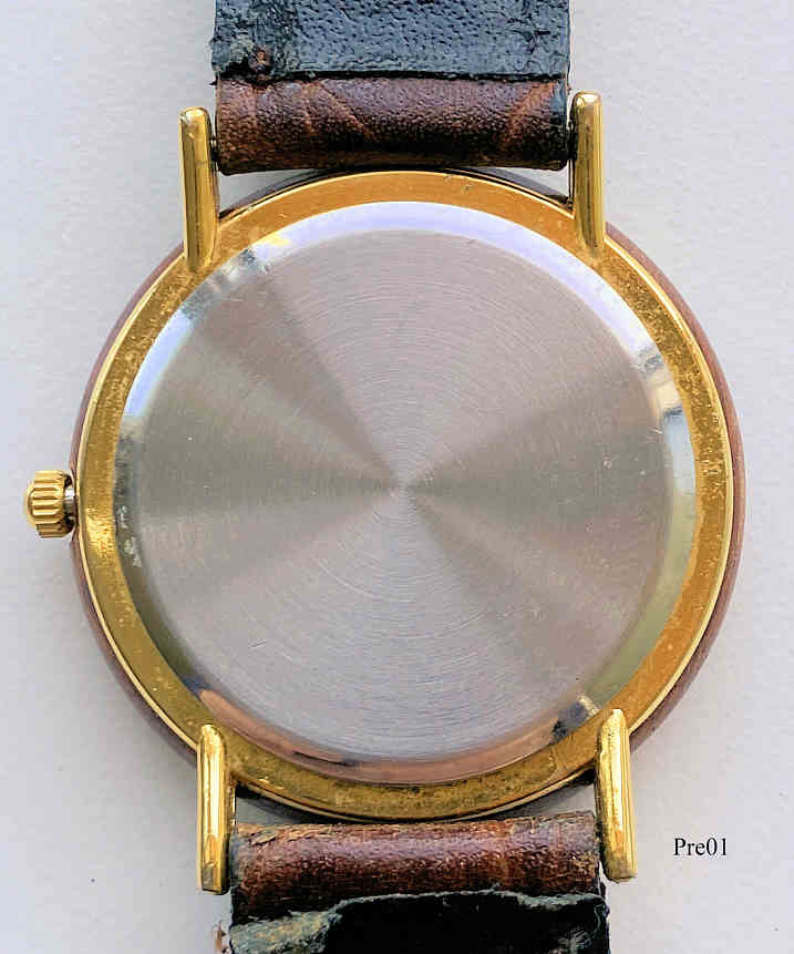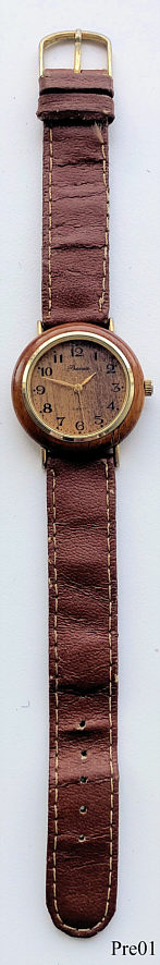 A beautiful woodwatch of Premia with quartz movement. The case is made of base metal, the wooden ring is glued on. Signed front: “Premia, Quartz”, inside: “No Jewel, Miyota Co. LTD, Japan, Unadjusted”. Brown leather band