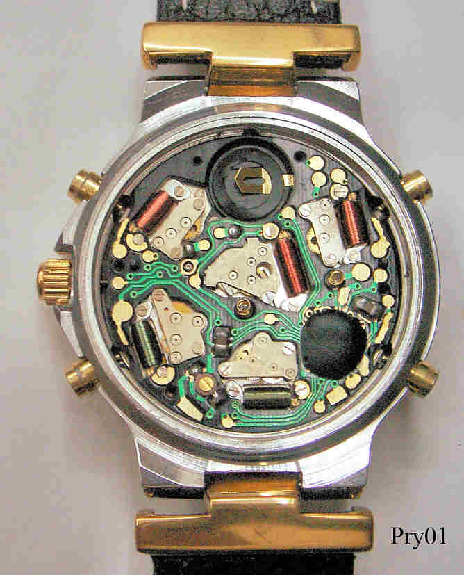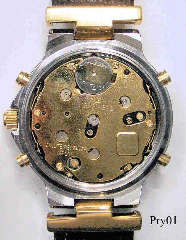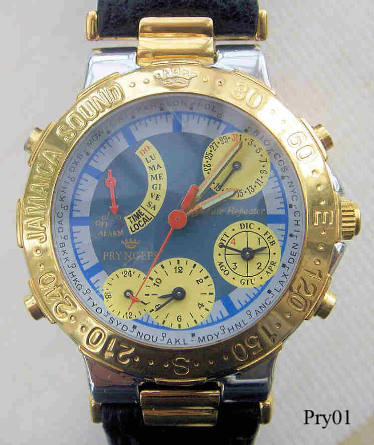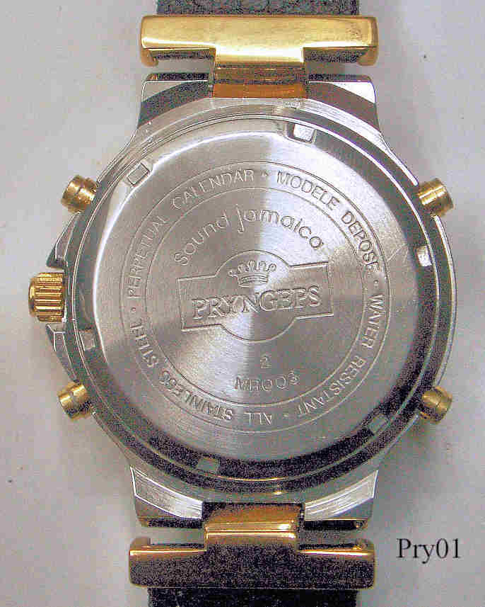 Ein Pryngeps Minute Repeater der Serie “Sound Jamaica” mit Stainless Steel Gehäuse und verschraubtem Stainless Steel Back, eine Quartz Uhr mit ewigem Kalender und Schlagwerk. Beschriftet: ”Pryngeps Minute Repeater”, hinten “Pryngeps, All Stainless Steel, Perpetual Calender, Modele Depose, Water Resistant, Sound Jamaica, 2, MR003”, innen: “Pryngeps, Minute Repeater, MR003”. Der Zeiger bei der 10 zeigt den Wochentag, bei der 2 den Tag, bei der 4 den Monat und Jahr 1-4, wobei 4 das Schaltjahr ist, bei der 6 die Weckzeit und bei der 7 der GMT Zeiger.