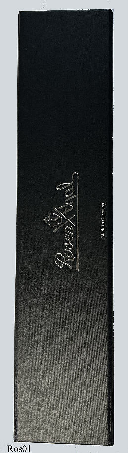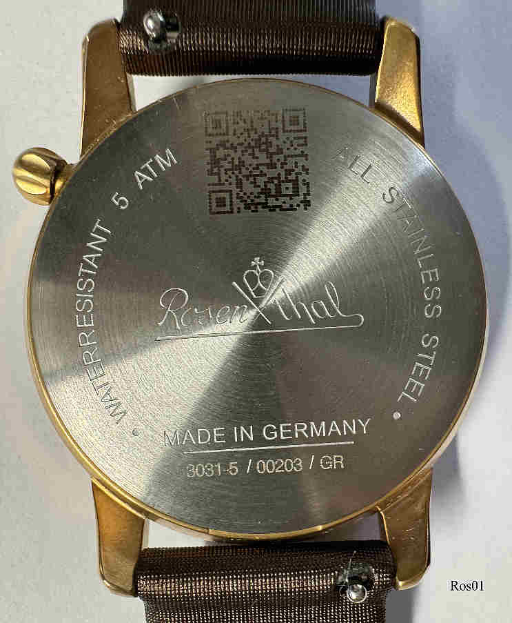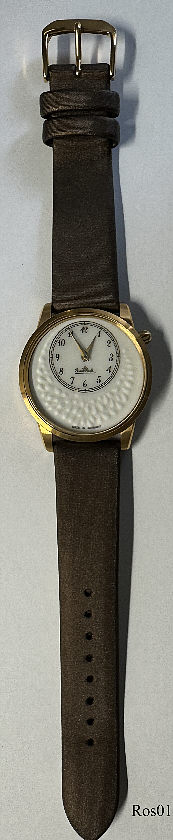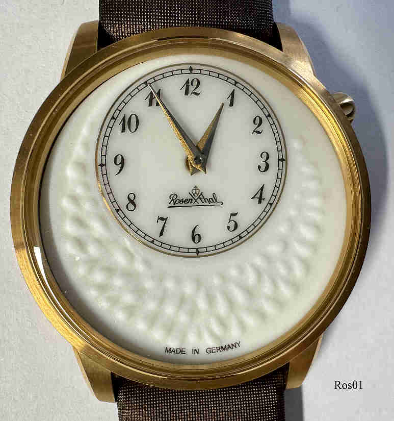 Eine Quartz Damen Schmuckuhr aus der Rosenthal Kollektion mit asymetrischem Zifferblatt aus weißem Porzellan.. Beschriftet vorn: ”Rosenthal, Made in Germany”¯, hinten: ¯Water Resistant 5 ATM, All Stainless Steel, Made in Germany, 3031-5 / 00203 / GR”€¯ innen: ”€¯Ronda OA, 1 One Jewel, SwissParts”, Das Werk ist ein Ronda OA Kaliber. Schwarzes Lederarmband.