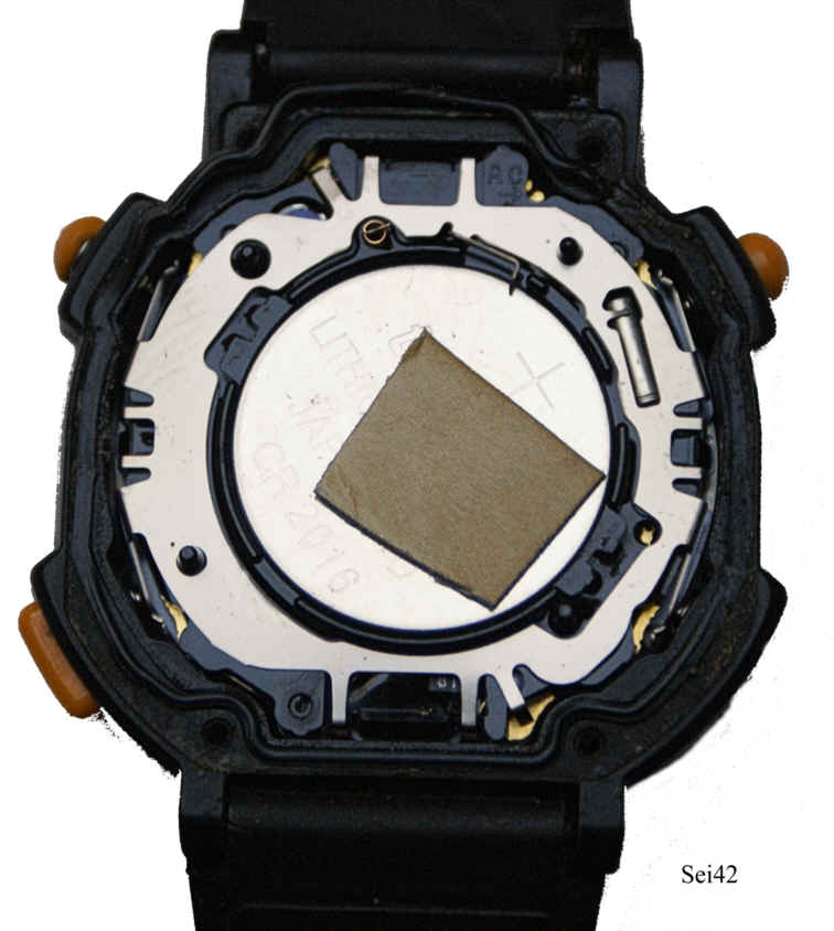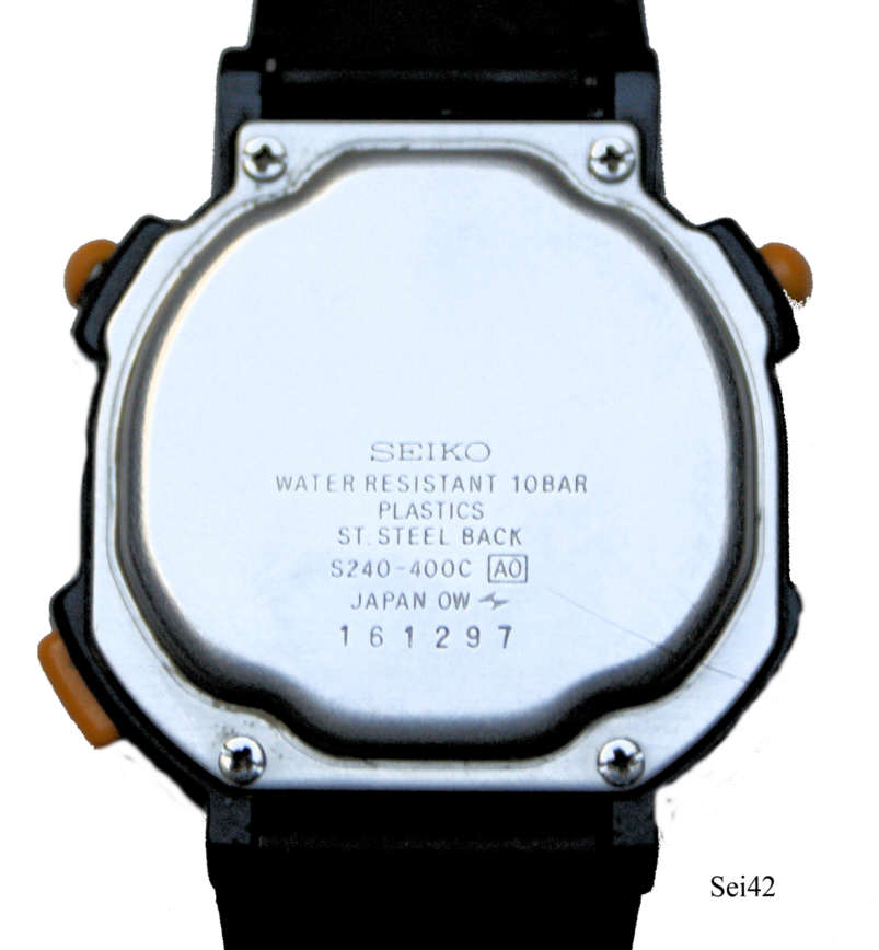 Dies ist eine Fitnessuhr von Seiko mit Puls Mefunktion. Beschriftung vorn: “Seiko, Pulsemeter”, innen: “ ”, hinten: “Seiko, Water Resistant 10 Bar, Plastics, Stainless Steel Back, S240-400C, A0, Japan OW, 161297” mit Stahlboden und Kautschuk Armband. Vorn in der Mitte ist der Puls Sensor. |