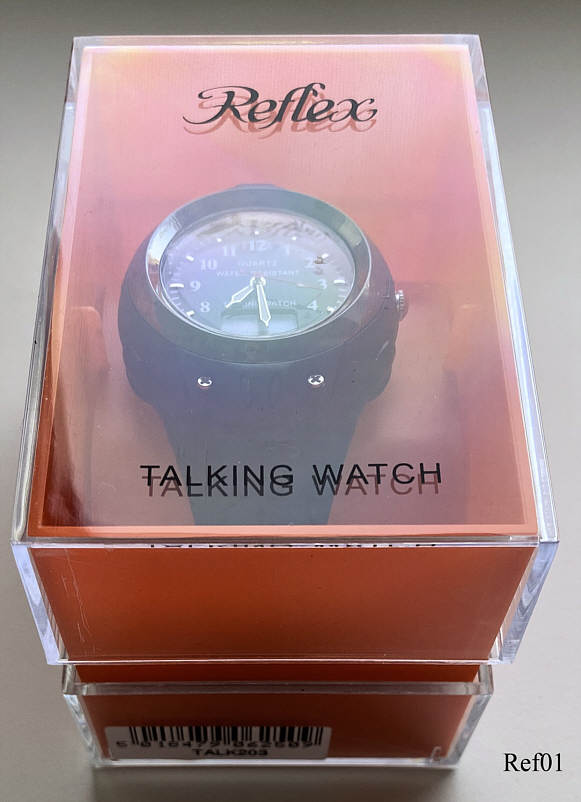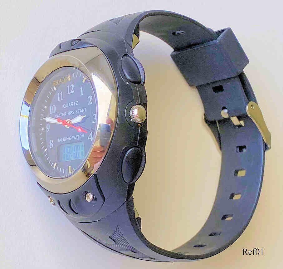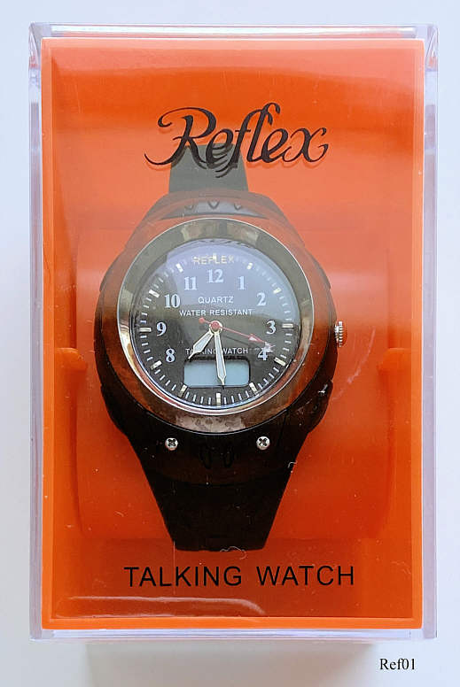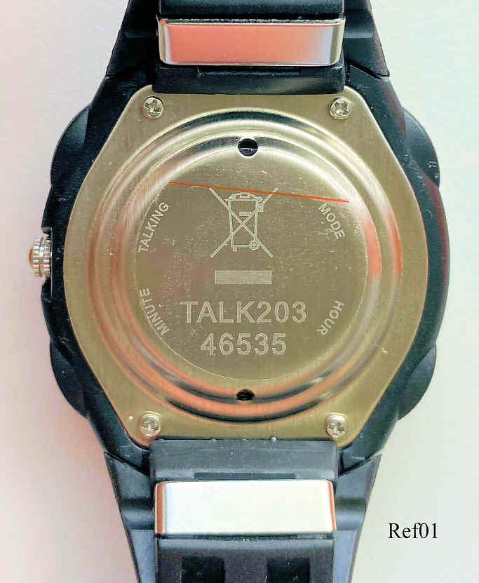 A talking watch from China with analog and digital display. Bezeichnet vorn: “QUARTZ, Water resistant, TalkingWatch”, hinten: “Talk 203, 46535”. Pressing the right button at “1”, the watch tells the time in englisch. .