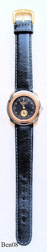 Eine Benetton by Bulova mit extra Sekunde bei der 6, Beschriftet vorn: ”United Colors of Benetton, by Bulova”, hinten: ”United Colors of Benetton, by Bulova, Mod. Dep.,Stainless Steel Back, Water Resistant, Base Metal Bezel.”, innen: “Swiss, Seven 7 Jewels, Unadjusted, 581.001”. Dunkel Grünes Lederarmband mit Benetton Schließe.