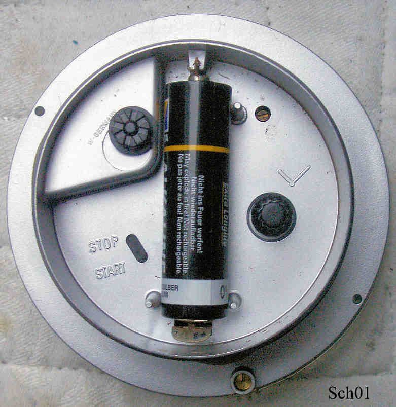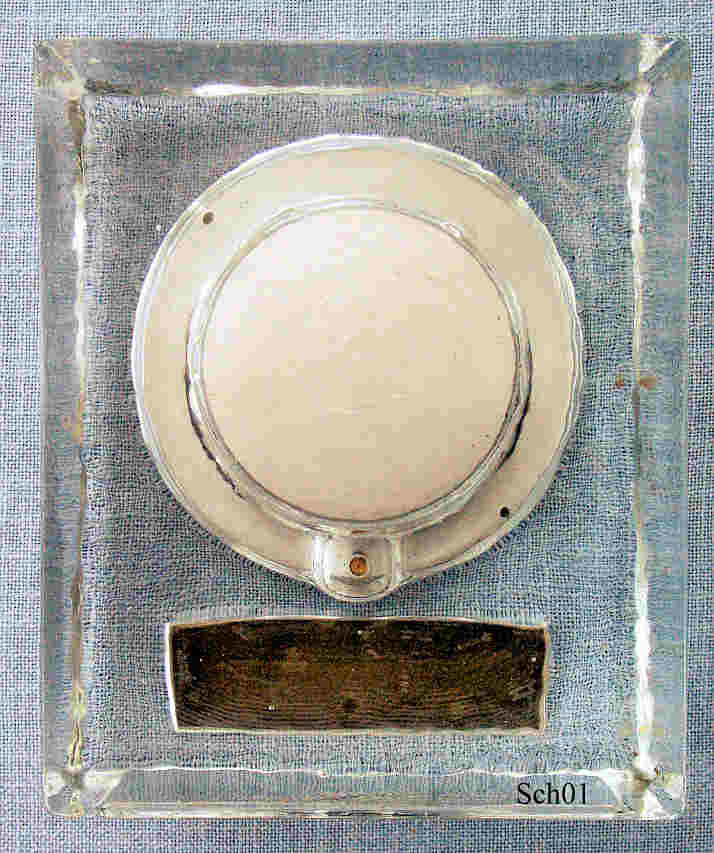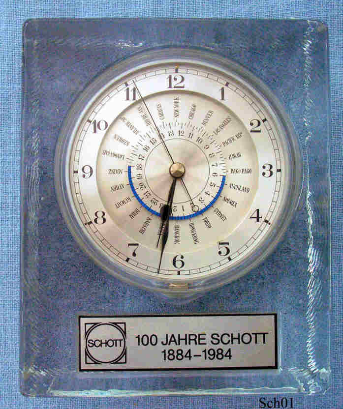 Eine Weltzeituhr, herausgegeben zum 100 jährigen Jubiläum der Firma Schott Glaswerke, eingefügt in einen Rohglasquader. Die Uhr hat zwei einstellbare Skalen, eine beschriftet mit großen Städten der Welt, die durch das Rändelrad unter der “6” verstellt werden kann, und eine mit 24 Stunden Einteilung, die über ein Rad auf der Rückseite gegen die zweite Skala verstellt werden kann. Damit kann man eine Stadt seiner Wahl als Zentrum unter die “12” stellen und auf der zweiten Skala dann die dazugehörige Zeit einstellen. Die Zeitskala läuft dann synchron mit der Uhr und zeigt entsprechend die Zeit der Städte an..