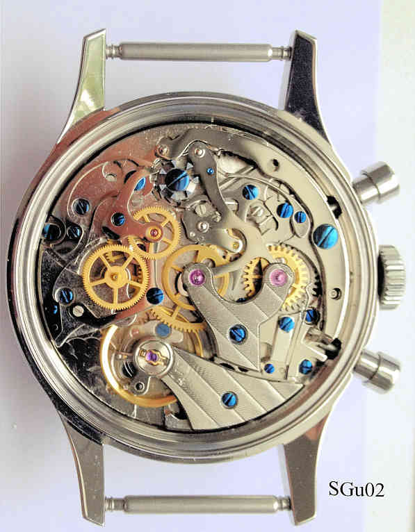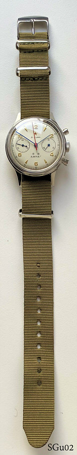 Ein Sea Gull Chronograph für die chinesische Luftwaffe. Das Original wurde 1963 gebaut, dies ist ein Nachbau von Seagull. Es handelt sich um einen Schaltrad Chronographen auf der Basis des Venus 175 Werkes. Beschriftet vorn: “Logo, 21 Steine”, hinten: “1963” und Logo, innen: “ ”. Gehäuse aus Base Metal, verschraubter Edelstahl Boden, Kaliber ST19.