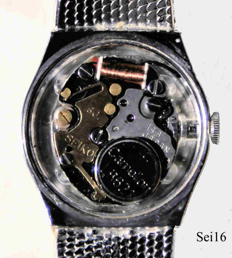 Dies ist eine silberne Seiko Damenuhr mit silbernem Zifferblatt, die Striche sind nur aufgesetzte Balken, Zeiger ebenfalls silber. Beschriftung vorn: ”Seiko, Quartz, Japan 1400- 0420 R”, hinten: “ Seiko, Base Metal Top, St. Steeel Back, 062212, 1400-0089, Japan-MS”, innen: “5J, Seiko, 14A, Japan”. Mit geklemmtem Stahlboden und integriertem silbernem Milanaisearmband.