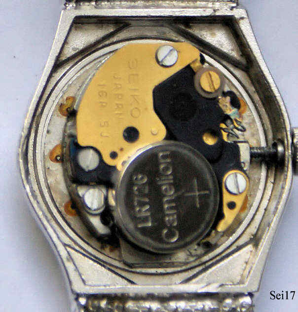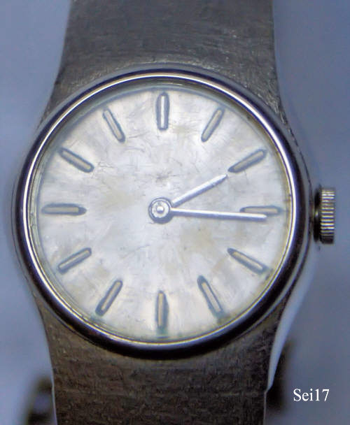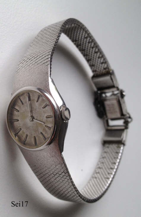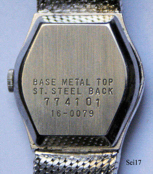Dies ist eine silberne Seiko Damenuhr mit abgeriebenem silbernem Zifferblatt, die Striche sind nur aufgesetzte Balken, Zeiger ebenfalls silber. Beschriftung vorn: abgerieben, hinten: “Base Metal Top, St. Steeel Back, 774101, 16-0079”, innen: “Seiko, Japan, 16A, 5J”. Mit geklemmtem Stahlboden und integriertem silbernem Milanaisearmband.
