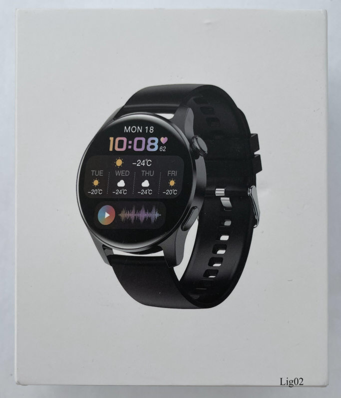 A Lige mens smart watch, model L11. The case is made of hardplastic. Signed front:” ”, hinten: ”RoHS, 44mm, BLEL 0W Power Consumption, Smart Watch TFT Display, Heart Rate, IP67 CE Made in China”. Connects via bluetooth with Android and IOS, functions see middle picture. Black plastic sports band.