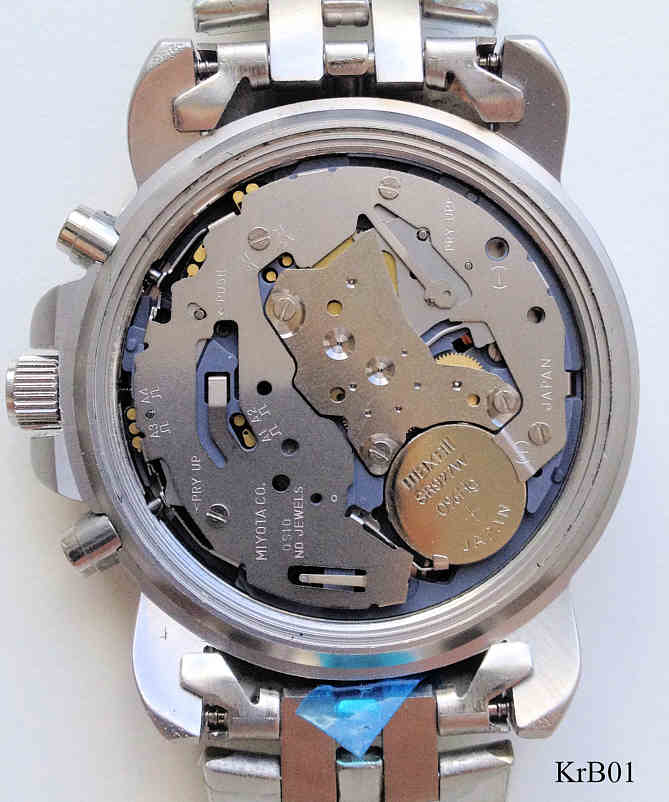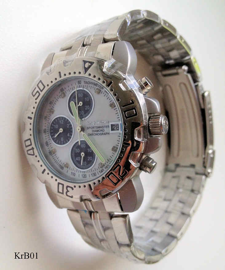 Ein Krug Baümen Quartz Chronograph mit drei schwarzen “Augen”. Kalender bei der 3, weißes Zifferblatt mit Zirkon besetzten Zifferpunkten. Werk Miyota Kaliber 0S10. Beschriftet vorn: “Krug Baümen, Sportsmaster, Diamond, Chronograph”, hinten: ”Krug-Baümen, Sportsmaster, Diamond, Registered, Model No. 241269DM/MO, R1396, Stainless Steel Bracelet, Stainless Steel Back, Water Resistant 3 ATM”, innen: “Miyota Co., 0S10, No Jewels, Japan”. Edelstahl Gliederarmband.