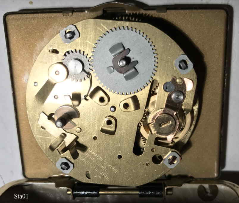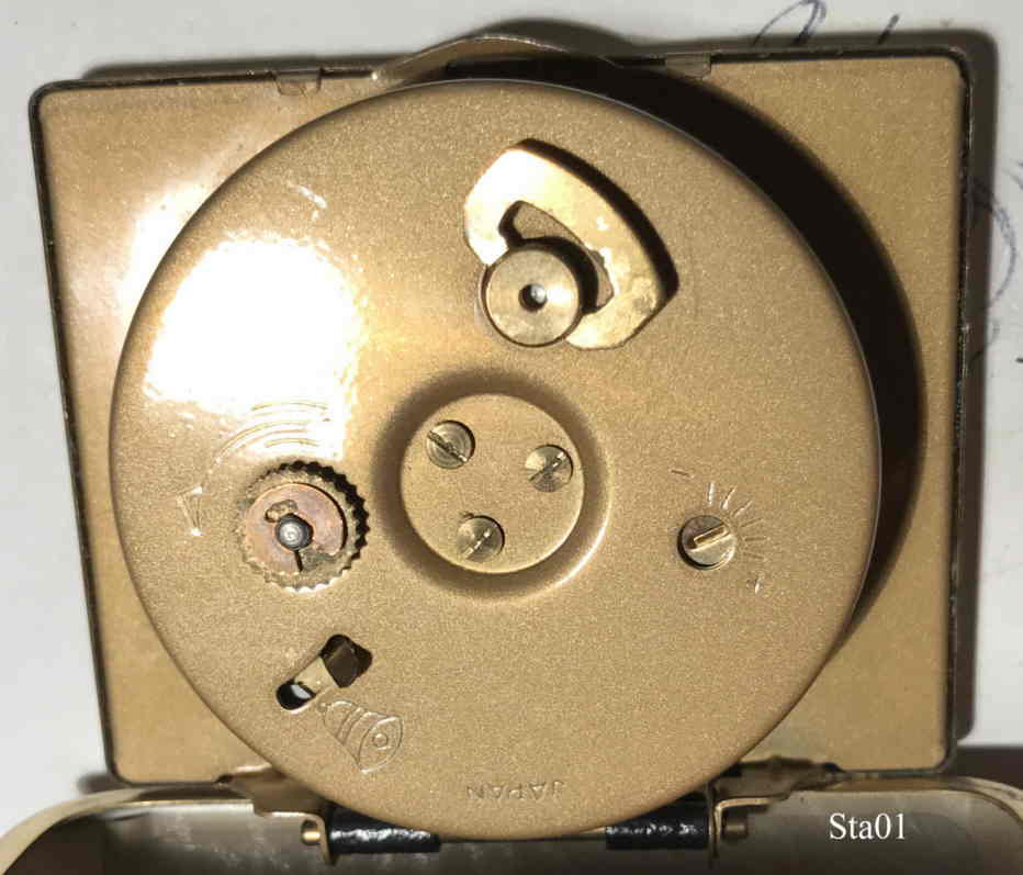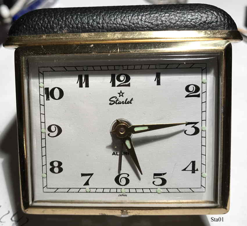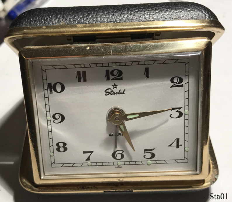 Ein Starlet Reisewecker mit Handaufzugswerk aus Japanischer Produktion. Weißes Zifferblatt. Bezeichnet vorn: “Starlet, Alarm”, innen: “Haramachi Seiki Co., No 0 Jewels, Unadjusted, Japan”. Auf der Rückseite kann man gut die Bedienelemente erkennen. Mit dem Hebel am .Weckersymbol schaltet man die Weckfunktion ein, mit dem Stellrad wird die Weckzeit bestimmt, der einfache Zeiger bei der 6 zeigt die Weckzeit. Aufgezogen wird mit dem oberen Stellhebel. Die Uhr misst 65 x 52 mm
