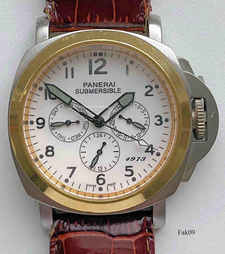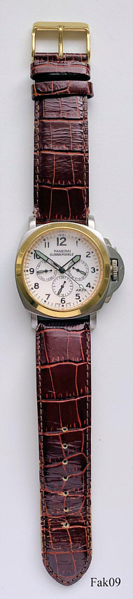 Dies ist ein nachgemachter Panerai Luminor Submersible, bei dem die Chronographen durch die Kalender Anzeigen ersetzt wurden, die Drücker dienen der Einstellung der Kalender. Innen ein recht ordentliches Automatic Werk mit Glasboden. Beschriftet: “€Panerai Submersible 1973”€. Braunes Lederarmband.