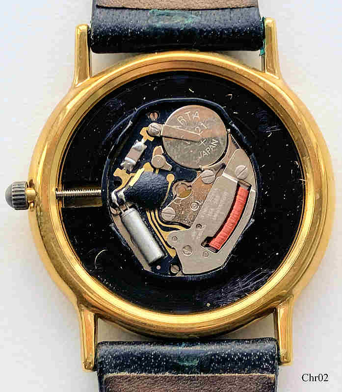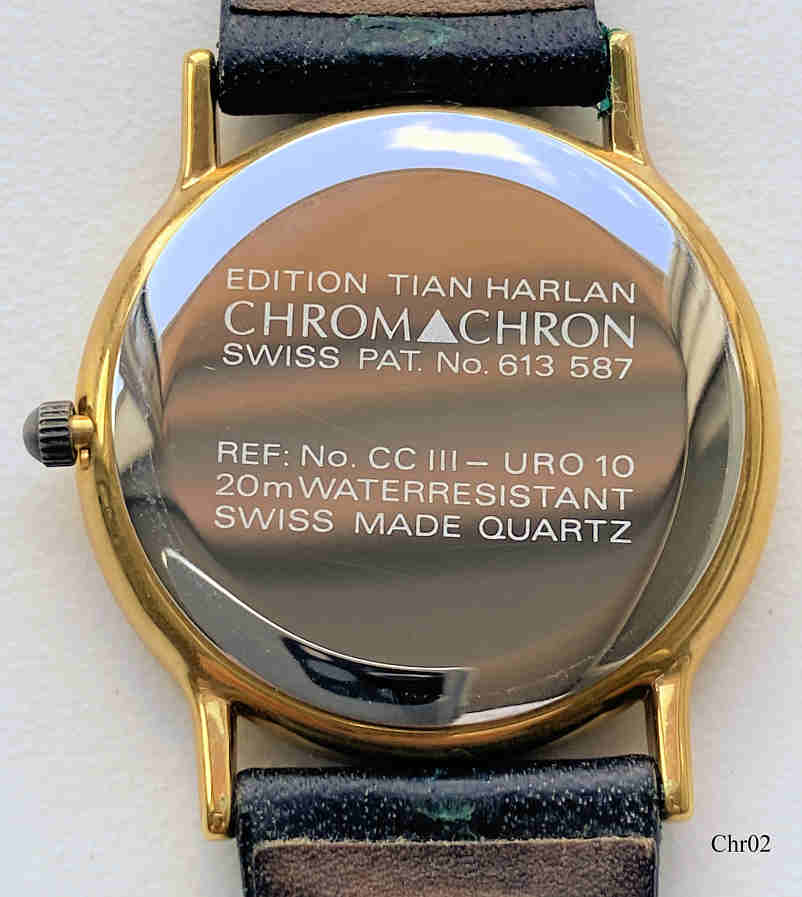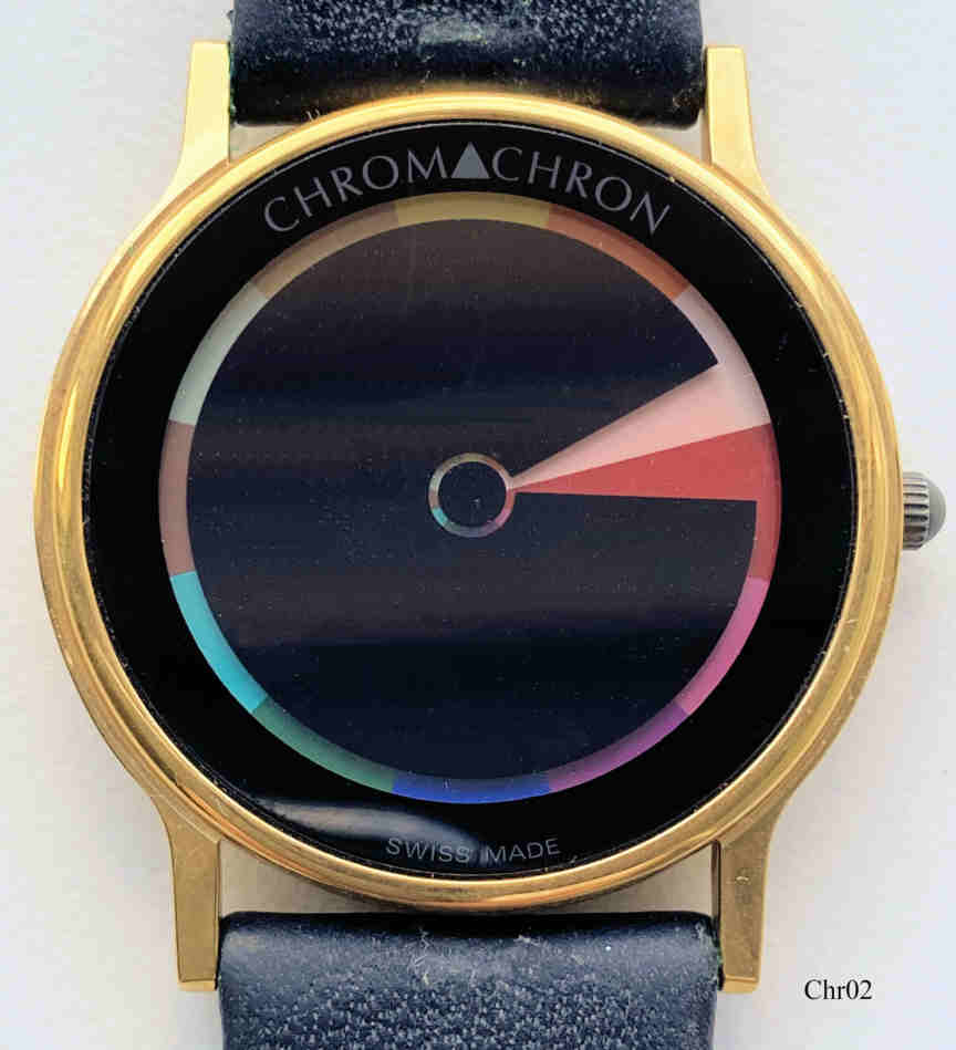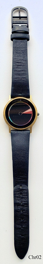 Eine sehr schöne Farbzeituhr von Chromachron, Edition Tian Harlan. Design-Klassiker aus dem Hause Pierre Cardin, gestaltet nach Originalentwürfen von TIAN HARLAN. Das goldfarbene Gehäuse ist aus Base Metal. Beschriftung vorn: “Chromachron, Swiss Made”, innen: ”AV, ISA268, 1 One Jewel, Unadjusted”, hinten: “Edition Tian Harlan, Chromachron, Swiss Pat. Nr. 613 587, Ref: No CC III - URO 10, 20 M Water Resistant, Swiss Made Quartz”. Uhrwerk Kaliber ISA 268. Schwarzes Lederarmband