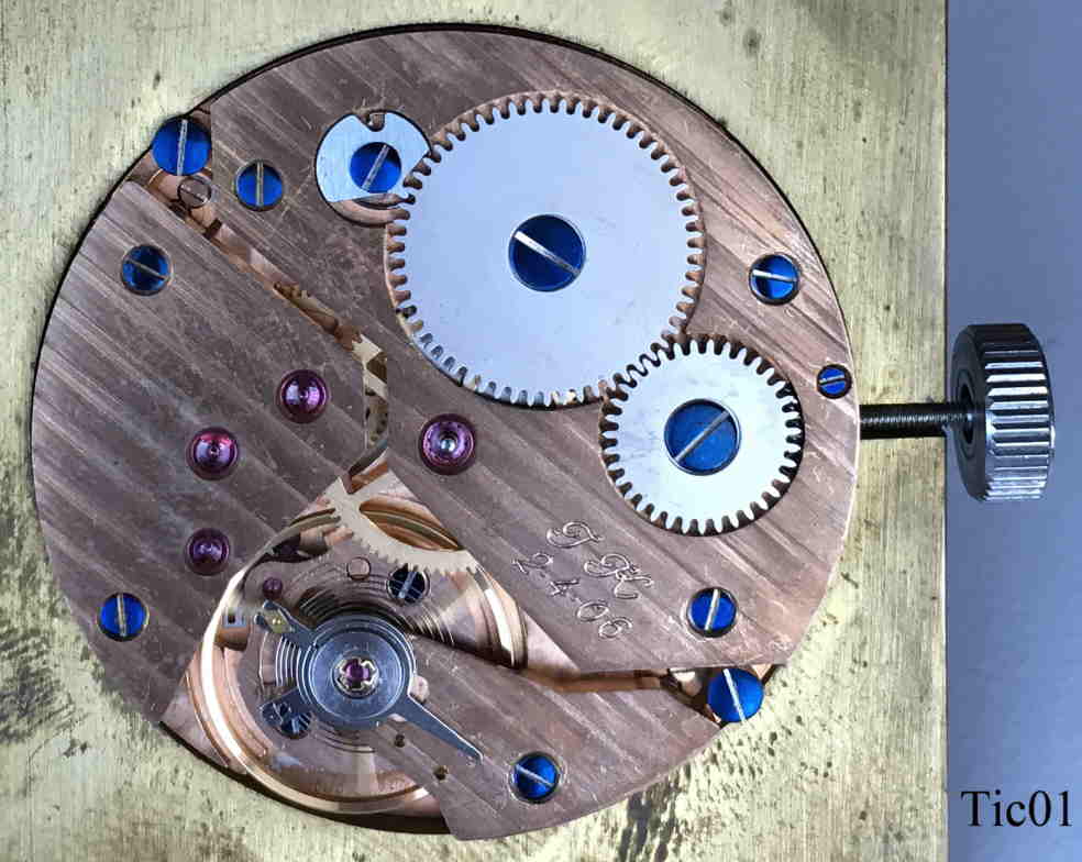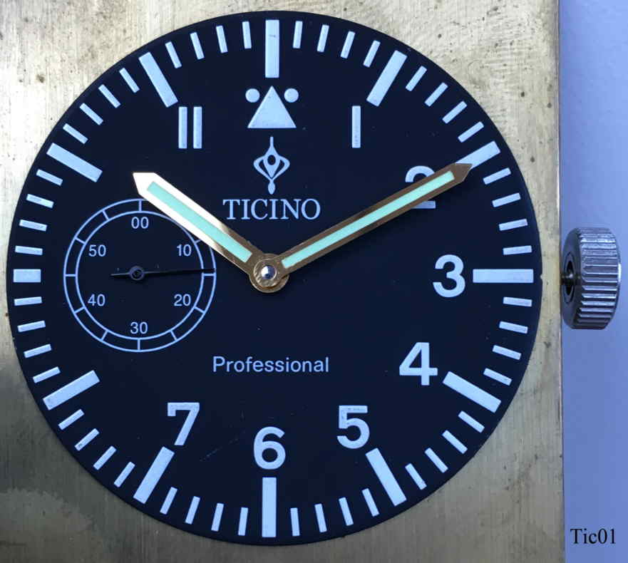 Eine Ticino Professional Handaufzugs Pilotenuhr. Normalerweise ist dieses Werk in einer Armbanduhr verbaut, wurde hier aber als Tischuhr in eine Messigplatte montiert. Diese wurde dann in eine Glasglocke mit Holzfuß eingesetzt. Beschriftet vorn: “TicinoProfessional”, hinten: “J.K., 2.4.06” Asian Cotes De Geneve 6497 Uhrwerk