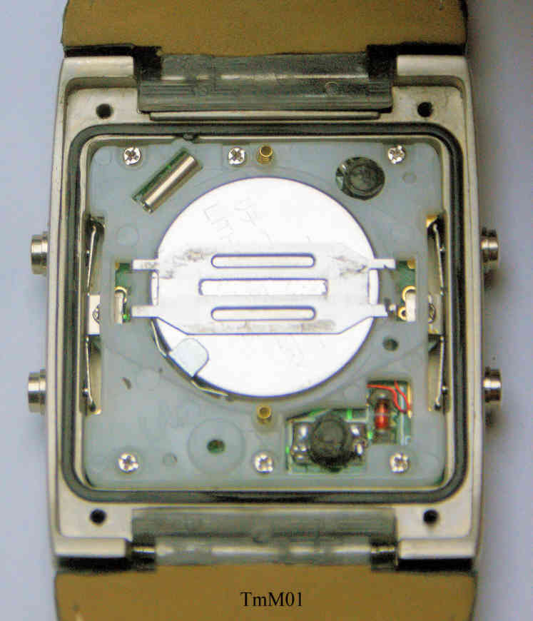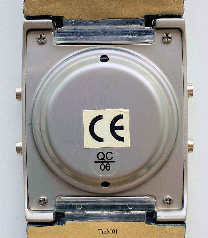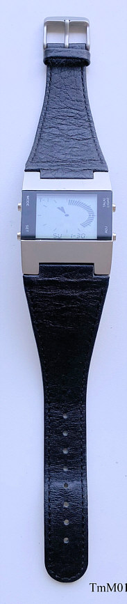 Dies ist eine Time Machine LCD Uhr, Modell “Time Warp”, mit etwas anderer Anzeige und Sprachausgabe. Funktionen: Time 1, Time 2, Weckzeit 1, Weckzeit 2, Datum, Kaleidoskop, Roulette. Sprachausgabe in Deutsch. Der Lautsprecher ist in der Rückwand. Keine Beschriftung. Base Metal Gehäuse, Edelstahlboden, Lederarmband mit neutraler Schließe.