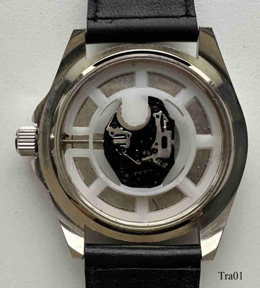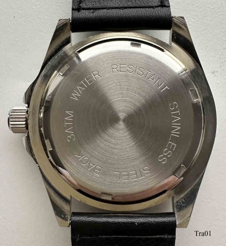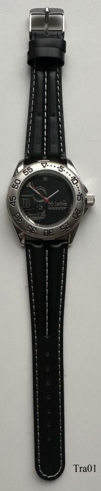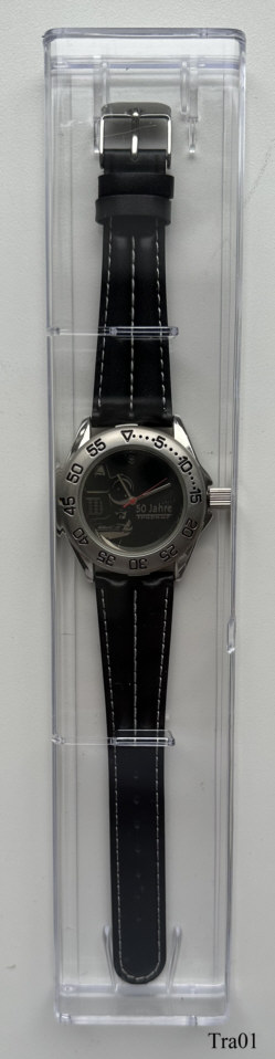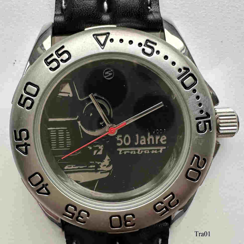 Eine Quartz Uhr zum 50 jährigen Jubiläum des legendären DDR Autos “Trabant 601”, Hersteller nicht erkennbar, wahrscheinlich UMF. Base Metal Gehäuse und verschraubtem Edelstahl Rückdeckel. Beschriftet vorn: “50 Jahre, Trabant, 2007”, hinten: ”Stainless Steel back, 3 ATM Water resistant”, innen: “SIIO, PC21S, Singapore, No Jewels”. Schwarzes Leder Armband
